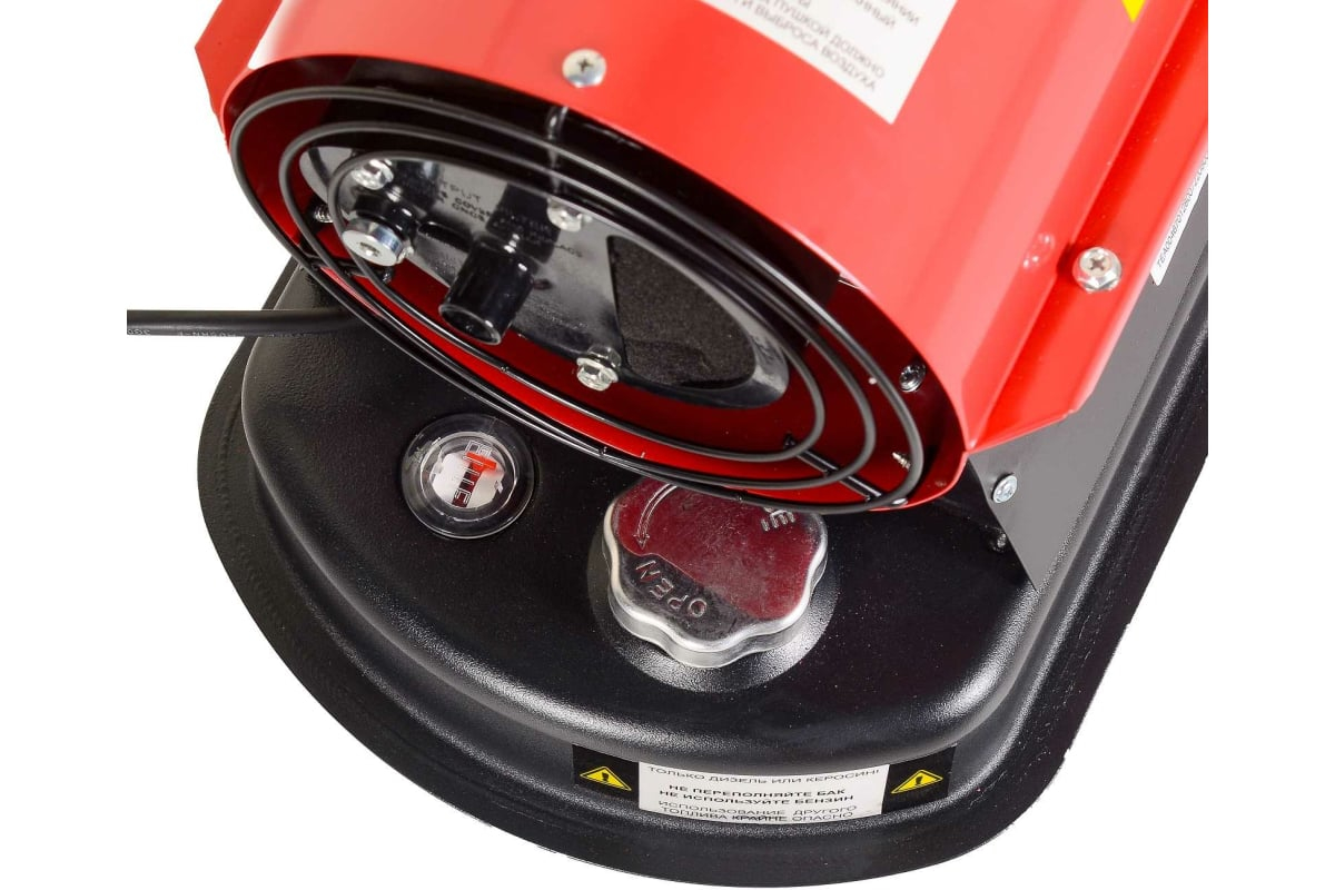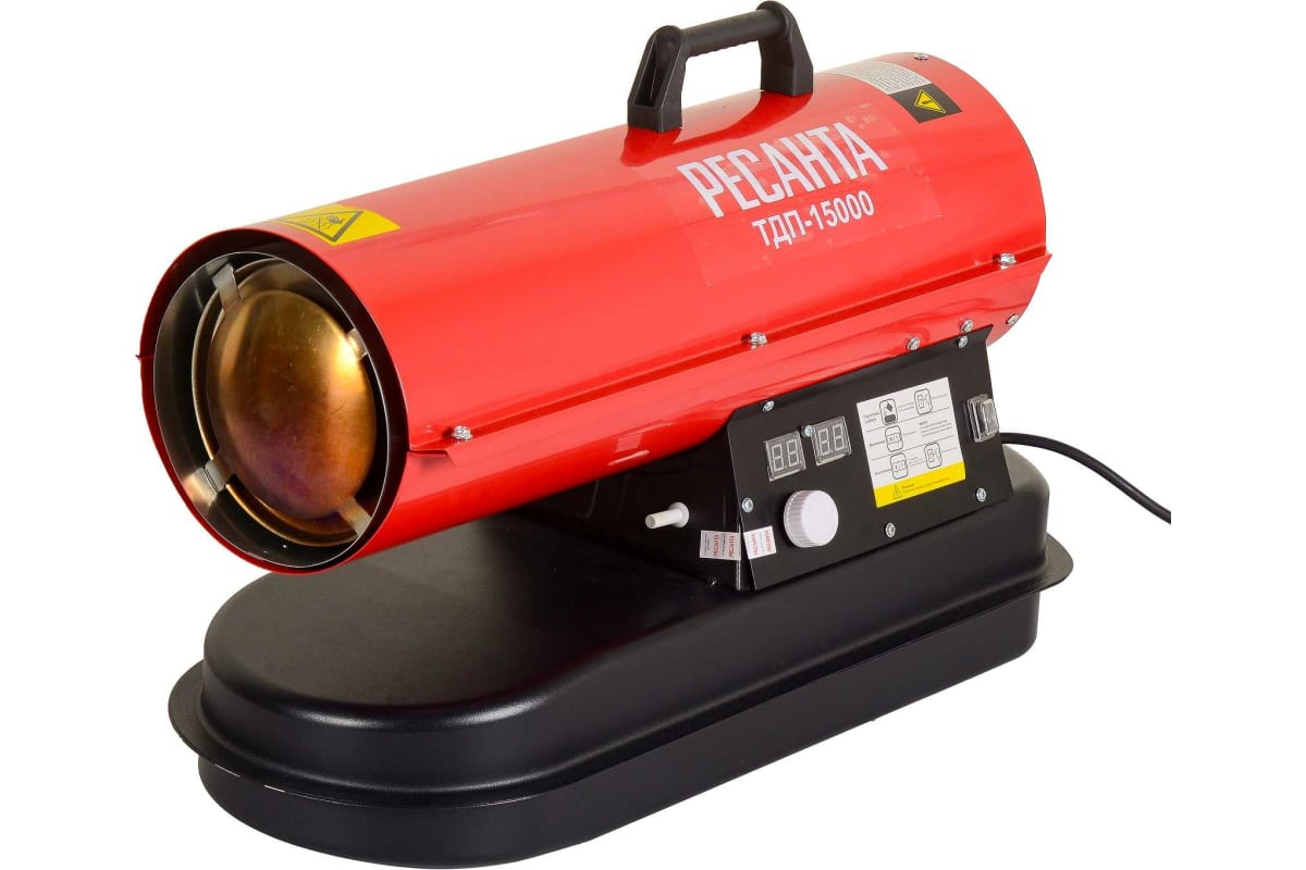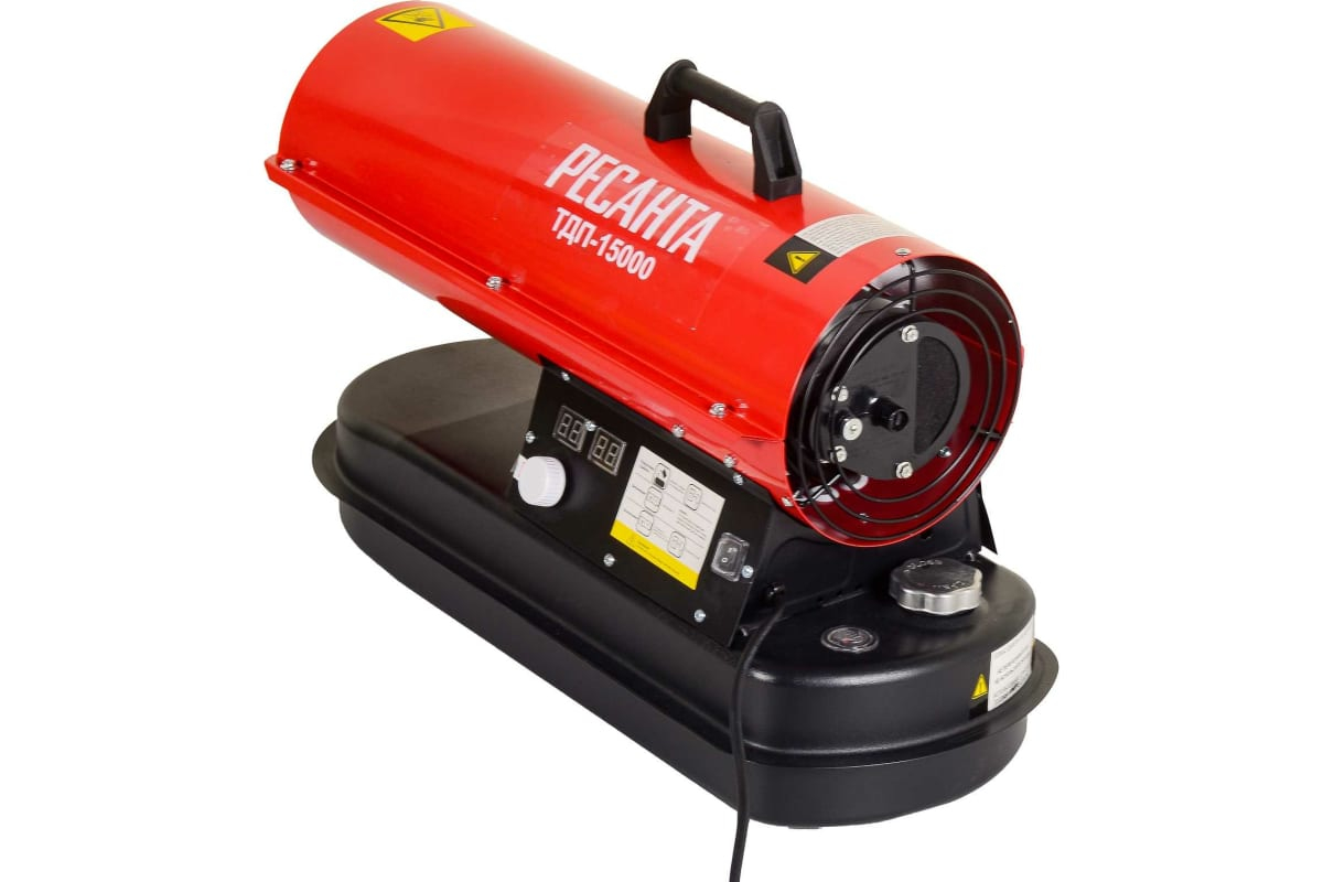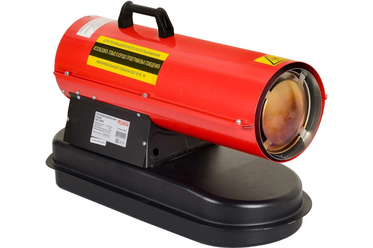 Дизельная тепловая пушка РЕСАНТА ТДП-15000 - функциональный обогреватель с прямым нагревом для отопления складских, строительных и других помещений. Тепловые пушки с прямым нагревом прогоняют воздушную массу непосредственно через горящее пламя, отдающее ей тепло, тем самым подавая в отапливаемую зону со всеми отходами, выделяемыми при горении дизельного топлива (солярки). Иными словами, дым, сажа и прочее попадают непосредственно в отапливаемую зону.