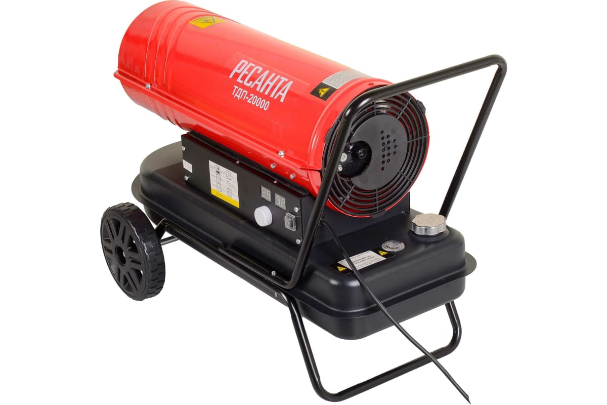 Дизельная тепловая пушка РЕСАНТА ТДП-20000 - Функциональный обогреватель с прямым нагревом для отопления складских, строительных и других помещений. Тепловые пушки с прямым нагревом прогоняют воздушную массу непосредственно через горящее пламя, отдающее ей тепло, тем самым подавая в отапливаемую зону со всеми отходами, выделяемыми при горении дизельного топлива (солярки). Иными словами, дым, сажа и прочее попадают непосредственно в отапливаемую зону. Мощность Вт 2000 Производительность, м3/ч 900 Тип управления Механический Вес без упаковки, кг 14.8 Частота, Гц 50 Питание От электросети Объем топливного бака, л 15 Материал Металл Наличие сетевой вилки Да Напряжение сети, В 220 Гарантия, мес. 12 Страна бренда Латвия Страна производства Китай Вес 25.5 кг Бренд Ресанта Габариты, см 80,5 х 36 х 46 Номинальная тепловая мощность на 1 уровне мощности, кВт 20 Тип топлива дизельное / керосин Расход топлива, кг/ч 1.58 Преимущества: 1. Такие обогреватели могут работать как на солярке, так и на отработанном масле или керосине, что еще больше увеличивает экономичность оборудования. 2. Мобильность. Дизельные пушки весят они немного: основную массу составляет бак с топливом, который может быть разного размера. Это дает возможность перевозить и устанавливать эти обогреватели в самых разных местах. 3. Мощность. Эффективность нагрева очень высокая. Можно подобрать соответствующую модель из очень большого модельного ряда, которая обеспечит максимальную эффективность при минимальных размерах устройства и затратах на его обслуживание. Особенно актуальным этот момент становится, когда необходимо быстро и достаточно сильно прогреть помещение, в котором ведутся ремонтные работы. В частности установка натяжных потолков. Пушка прогреет воздух до нужной температуры, за считанные минуты. Высокая мобильность такого отопителя, позволит без труда занести его в комнату, а после убрать. И для этого не понадобится привлекать дополнительный персонал все можно сделать силами тех мастеров, которые занимаются непосредственно монтажом покрытия. 4. Безопасность. Газовые пушки по этому параметру будут далеко не лидерами, а электрические обогревательные приборы требуют наличия электроснабжения. Так что, сложив все плюсы этих устройств, получим один из наиболее удобных и экономичных способов обогреть большую площадь. 5. Надежность. Обогреватели, использующие для нагрева солярку, практически не ломаются, а осуществить ремонт дизельных тепловых пушек значительно проще, чем, например, газового оборудования. Защита от угасания пламени и от воспламенения. Применение: 1. Наибольшее признание дизельные пушки Ресанта получили при обогреве складских, строительных и других помещений, где использование обычных видов отопления либо затруднено, либо попросту невозможно. Особенно актуально использование подобного оборудования там, где еще нет прямого подключения к электрическим сетям. Для работы тепловая дизельная пушка тоже расходует электричество, но его требуется совсем немного. Требуемую мощность вполне может обеспечить переносной генератор. 2. Основные требования к использованию различаются в зависимости от типа используемого оборудования. Если использовать пушки с прямым нагревом, должна осуществляться вентиляция отапливаемой зоны. Такие тепловые агрегаты обычно используют д