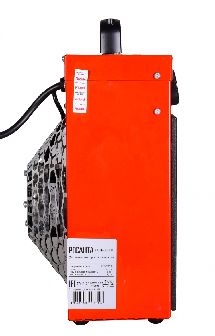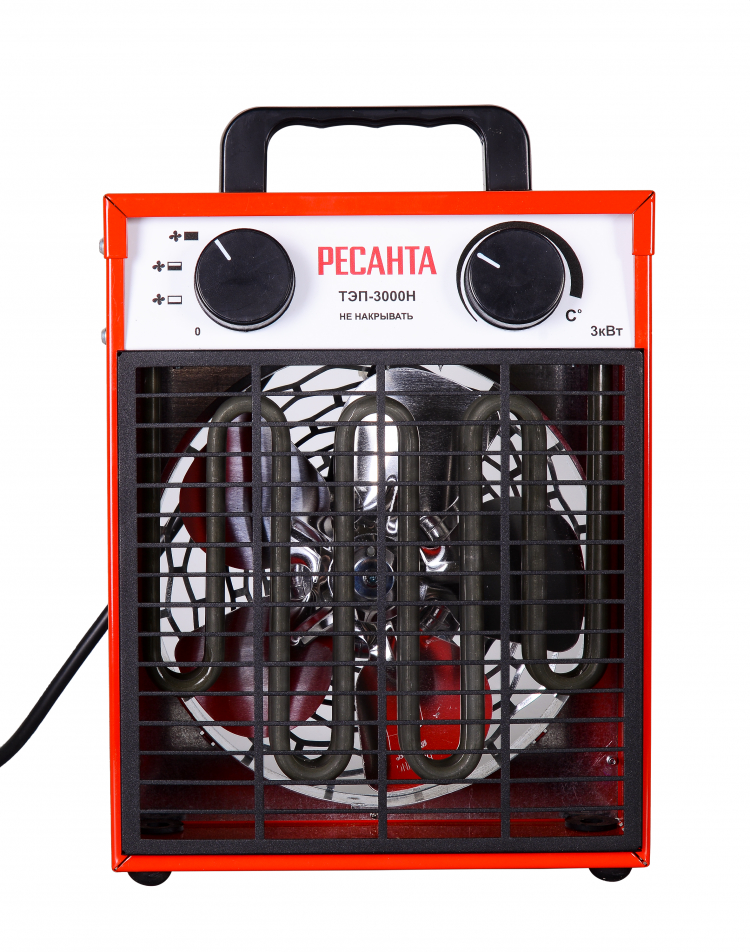 Тепловая электрическая пушка РЕСАНТА ТЭП-3000Н предназначена для вентиляции и обогрева жилых и производственных помещений, складов, гаражей, а также для обогрева и сушки в строительстве. Прибор относится к тепловым пушкам компактного типа. Нагревательный элемент - трубчатый. Данная модель рассчитана на питание от электросети переменного тока частотой 50 Гц, номинальным напряжением 220-230В (однофазная). Устанавливается на полу. Обогреватель оснащен регулировкой режимов работы (мощности): Режим 1: 50 Вт (в этом режиме работает только вентилятор. Функция обогрева отключена) Режим 2: 1500 Вт Режим 3: 3000 Вт Терморегулятор предназначен для регулировки температуры; Резет данная кнопка предназначена для перезапуска термореле после перегрева (данная функция установлена в моделях начиная с 3000Вт и выше, кроме ТЭПК); Регулировка режимов работы данная регулировка предназначена для выбора режимов работы; Режим выключения данная функция предназначена для отключения режимов работы; Режим вентилятора данная функция предназначена для включения вентилятора, а также применяется на 10-15 секунд перед отключением устройства для охлаждения тэнов; Режим работы на 50% мощности данная функция позволяет включить вентиляцию с включением половины нагревательных элементов; Режим работы на 100% мощности данная функция позволяет включить вентиляцию с включением всех нагревательных элементов. Производительность, м3/ч 400 Количество режимов 3 Тип управления Механический Вес без упаковки, кг 5.2 Частота, Гц 50 Питание От электросети Регулятор температуры Да Материал Металл Наличие сетевой вилки Да Мощность, Вт 3000 Напряжение сети, В 220 Возможности Регулировка мощности, вентиляция без нагрева, термостат Гарантия, мес. 12 Страна бренда Латвия Страна производства Россия Вес 3.35 кг Бренд Ресанта Габариты, см 22 х 21 х 31 Важно: не накрывать и не ставить тепловую пушку на ковровые покрытия. Помещения должны быть сухими, с температурой от минус 10 до плюс 40°С.