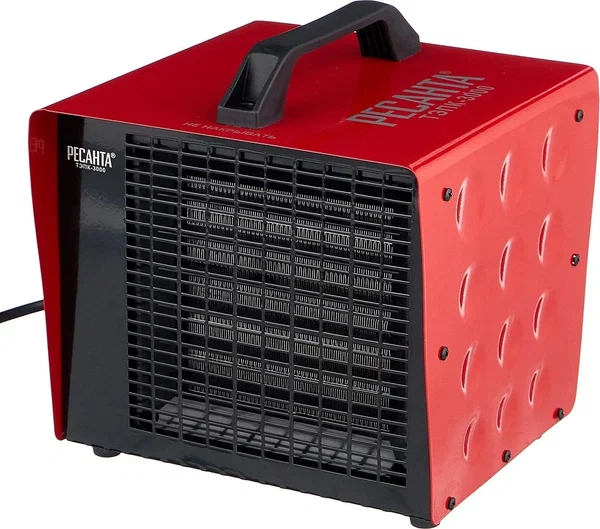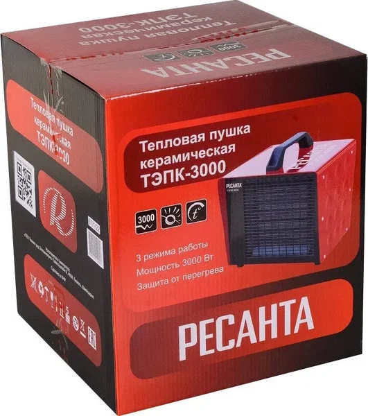 Тепловая электрическая пушка РЕСАНТА ТЭПК-3000 предназначена для вентиляции и обогрева жилых и производственных помещений, складов, гаражей, а также для обогрева и сушки в строительстве. Производительность, м3/ч: 300 Количество режимов: 3 Тип управления: Механический Вес без упаковки, кг: 2.4 Частота, Гц: 50 Питание: От электросети Регулятор температуры: Да Материал: Металл Наличие сетевой вилки: Да Мощность, Вт: 3000 Напряжение сети, В: 220 Гарантия, мес.: 12 Страна бренда: Латвия Страна производства: Россия Габариты, см: 23,5 х 21,5 х 30,0 Вес: 3.4 кг Прибор относится к тепловым пушкам круглого типа. Нагревательный элемент - керамический. Данная модель рассчитана на питание от электросети переменного тока частотой 50 Гц, номинальным напряжением 220-230В (однофазная). Устанавливается на полу. Обогреватель оснащен регулировкой режимов работы (мощности): Режим 1: 25 Вт (в этом режиме работает только вентилятор. Функция обогрева отключена) Режим 2: 2000 Вт Режим 3: 3000 Вт Преимущества: Быстрый нагрев; Не сжигает воздух; Защита от перегрева; Терморегулятор; Регулировка режимов работы данная регулировка предназначена для выбора режимов работы; Режим выключения данная функция предназначена для отключения режимов работы; Режим вентилятора данная функция предназначена для включения вентилятора, а также применяется на 10-15 секунд перед отключением устройства для охлаждения тэнов; Режим работы на 70% мощности данная функция позволяет включить вентиляцию с включением половины нагревательных элементов; Режим работы на 100% мощности данная функция позволяет включить вентиляцию с включением всех нагревательных элементов.