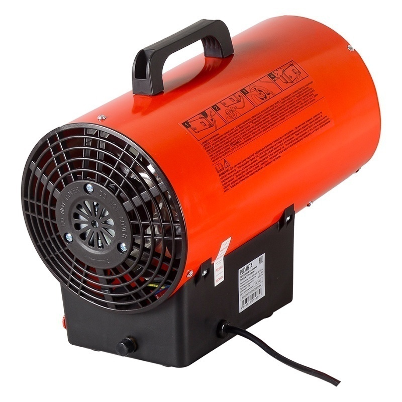 Газовая тепловая пушка РЕСАНТА ТГП-10000 Воздухонагреватель, работающий на сжиженном газовом топливе. Топливо необходимо для получения горячей атмосферы в камере сгорания, а электроэнергия, подводимая к устройству, необходима для питания вентилятора, нагнетающего воздух, и для функционирования автоматики. Газовые пушки прямого нагрева являются простой и надёжной конструкцией без дымохода, где горячий воздух из устройства поступают в помещение. Самая распространённая сфера применения тепловых пушек: монтаж натяжных потолков. Также часто используют в помещениях без центрального отопления: ремонтные цехи, склады, частные гаражи. без дымохода, где горячий воздух из устройства поступают в помещение. Расход топлива, л/ч 0.81 Производительность, м3/ч 300 Тип управления Механический Площадь, м2 60 Вес без упаковки, кг 5.9 Частота, Гц 50 Материал Металл Давление, бар 0.7 Мощность, Вт 10000 Напряжение сети, В 220 Возможности Пьезорозжиг, защита от перегрева, температурный датчик на клапане газа Гарантия, мес. 12 Вес 5.9 кг Габариты, см 48,5 x 23 x 27