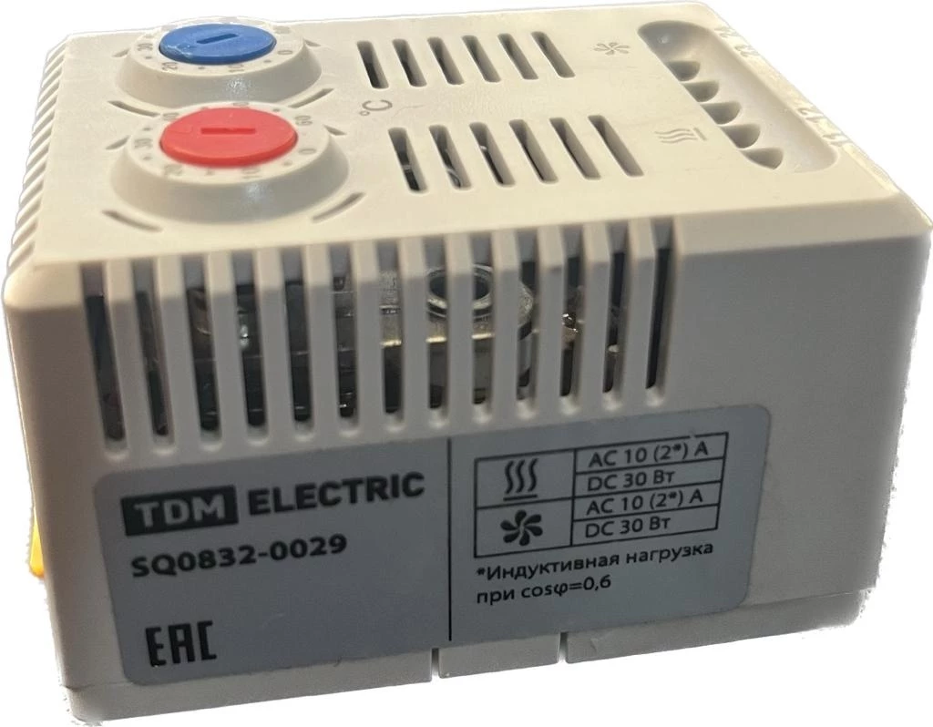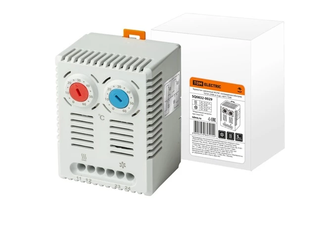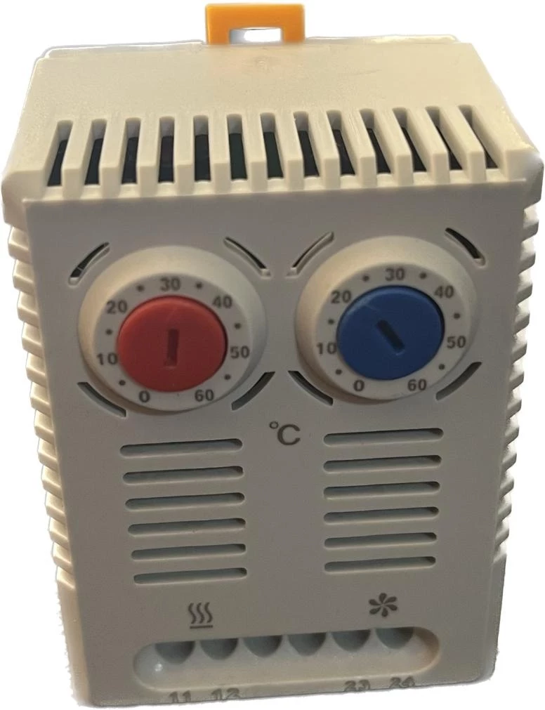 Применяется для управления вентиляторами и/или обогревателями в шкафах и сборках с целью поддержания заданных параметров температуры. Рабочим элементом механического термостата является биметаллическая пластина в зависимости от температуры окружающей среды меняющая свою форму, воздействуя на контакт. Одновременное или независимое управление двумя устройствами: охлаждение - синяя регулировка (NO-контакт) и обогрев - красная регулировка (NC-контакт). Корпус - не поддерживающий горение пластик (ПА-66). Способ монтажа: на Din-рейку Режим работы: нагрев или охлаждение Номинальное напряжение: 220(230) В Номинальный ток: 10 А Степень защиты: IP20 Габариты без упаковки: 67х50х46 мм Диапазон регулируемых температур: от 0 до +60 °С