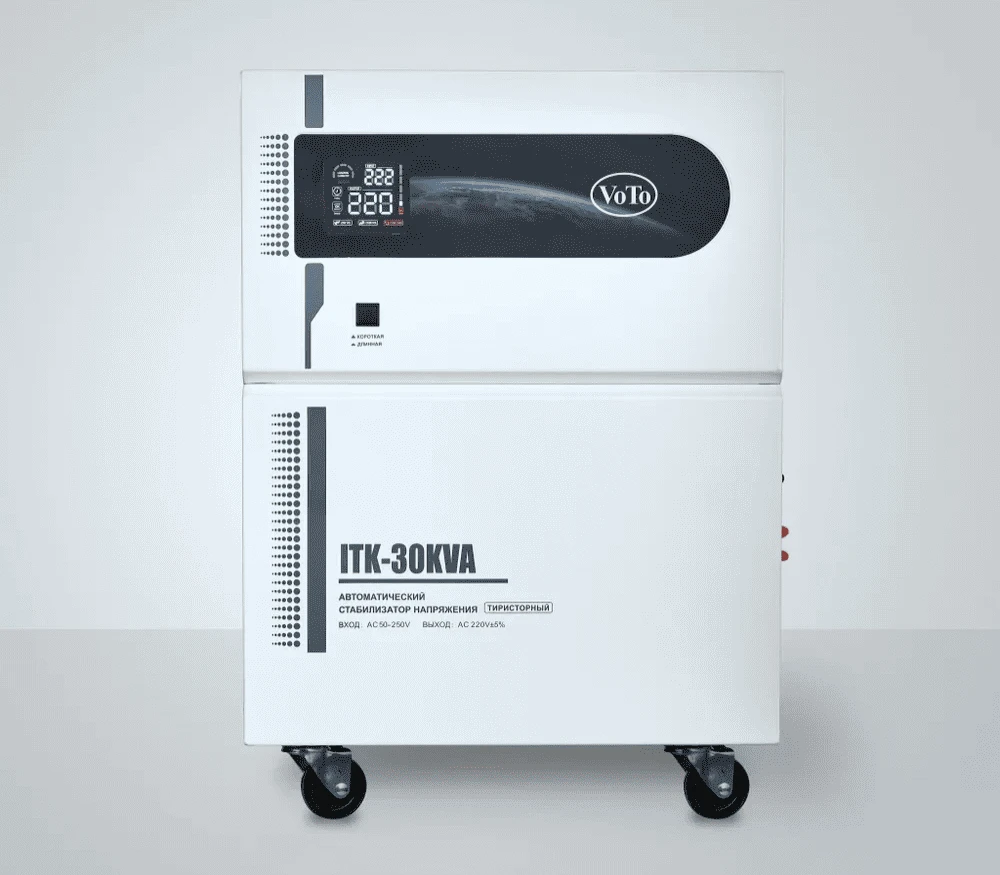 Тиристорные стабилизаторы напряжения VoTo серии ITK50 - это надежное и комфортное устройство для защиты электроприборов от некачественной сети и не имеет аналогов на отечественном рынке с подобными параметрами качества, цены и технических характеристик. Стабилизатор VoTo ITK50 - 30 кВА предназначен для напольного исполнения, с установкой в помещении и на улице, для защиты при частых перепадах напряжения частных домовладений, квартир, магазинов и предприятий для промышленных нагрузок. Тип стабилизатора: тиристорный Режим работы: непрерывный Тип сети: однофазная Полная мощность, ВА: 30000 Максимальный входной ток, А: 150 Рабочий диапазон входных напряжений, В: 50-260 Отклонение выходных напряжений, %: ±5 Номинальное выходное напряжение, В: 220 Частота, Гц: 50-60 Время реакции на изменение напряжения, мс: 20 Задержка включения, сек: 200, 5 КПД при полной нагрузке, %: 95 Подключение клеммная: колодка Режим "БАЙПАС": есть Дисплей: LED-дисплей Индикация: входное напряжение / выходное напряжение / сеть / защита / задержка Тип охлаждения: воздушное (конвекционное и принудительное) Степень защиты от внешних воздействий по ГОСТ 14254-96: IP20 Температура эксплуатации, °С: -20...+40 Относительная влажность, %: 0 - 80 (без конденсата) Способ установки: напольный Размеры, мм: 615х435х465 Вес, кг: 62 Коммутация обмоток трансформатора осуществляется с помощью полупроводниковых ключей - тиристоров, таким образом корректировка напряжения происходит бесшумно, без износа и без помех для подключенной техники. Преимущества: Высокая скорость реакции - тиристоры переключаются 20 мс, что позволяет мгновенно реагировать на изменения напряжения. Высокий КПД, который достигается благодаря отсутствию реле и подвижных элементов. Бесшумность - нет звуков двигателя, скрежета щёток или щелчков реле - только тихая работа электроники. Надёжность и долговечность, благодаря отсутствию движущихся частей исключает износ щёток, поломку двигателя и необходимость техобслуживания. Работа при минусовых температурах т.к. тиристорные стабилизаторы могут эксплуатироваться при 25 °C и ниже. Широкий диапазон входного напряжения от 50 до 260 Вольт с точностью выходного напряжения до 5% - актуально для нестабильных сетей. Тиристорные стабилизаторы VoTo ITK50 - это отлично решение, когда необходима скорость реакции, бесшумность, долговечность и используют для защиты систем отопления и насосных станций, бытовой техники и электроники, для обеспечения стабильного питания серверов, сетевого оборудования и систем видеонаблюдения, в диагностических кабинетах (УЗИ, рентген, лабораторные анализаторы, эндоскопия) и для майнинга, для станков с ЧПУ и другой требовательной к питающей сети техники.