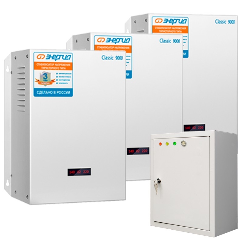 Энергия Ultra 27000 обеспечит защиту трехфазных и однофазных потребителей подключенных к сети 380 Вольт. Стабилизатор работает с погрешностью выходного напряжения до 3%, в диапазонах входного напряжения 240-435В. Тип напряжения: Трехфазный Состав комплекта: 3 блока 220В по 9 кВА + БКС Принцип стабилизации: Тиристорный Мощность (кВА): 27 Режим работы: Непрерывный Способ установки: Напольный, Настенный Тип охлаждения: Воздушное (конвекционное и принудительное) Дисплей: Цифровой Индикация: Входное напряжение, Выходное напряжение, Ступень стабилизации Подключение: Клеммная колодка Режим "БАЙПАС": Есть Задержка включения: 6 секунд Предельный диапазон входных напряжений (В): 60-265 Рабочий диапазон входных напряжений (В): 138-250 Рабочий диапазон выходных напряжений (В): 213-227 Номинальное выходное напряжение (В): 380 Отклонение выходных напряжений: ±3% Время реакции на изменение напряжения (мс): 20 Количество ступеней регулировки: 16 Защита от повышенного напряжения, откл. при: 265В Защита от пониженного напряжения, откл. при: 60В Защита от перегрева трансформатора, откл. при: 120 °С Защита от перегрузки по току: Автоматический выключатель Контроль обрыва фаз: Есть Контроль перекоса фаз: Есть Контроль чередования фаз: Есть Степень защиты от внешних воздействий по ГОСТ 14254-96: IP20 Температура эксплуатации (°С): -30...+40 Температура хранения (°С): -40...+45 Относительная влажность (%): 80 КПД при полной нагрузке (%): 98 Габаритные размеры (мм): 320х180х1260 Вес (кг): 65 Производитель: Энергия Cтрана производства: Россия Гарантия: 36 месяцев Расчетный срок службы: 15 лет Применение: Для дачи, Для частного дома, Для промышленных нужд Примененная схема тиристорной коммутации обеспечивает бесшумный процесс стабилизации, высокое быстродействие и длительный срок службы (не менее 15 лет). Стабилизатор рассчитан на непрерывную работу. Для воздушного охлаждения используется как естественная конвекция, так и принудительная вентиляция. Три идентичных силовых блока контролируются общим блоком контроля фаз, обеспечивающим индикацию режимов работы и функционирование системы защиты при аварийных ситуациях.