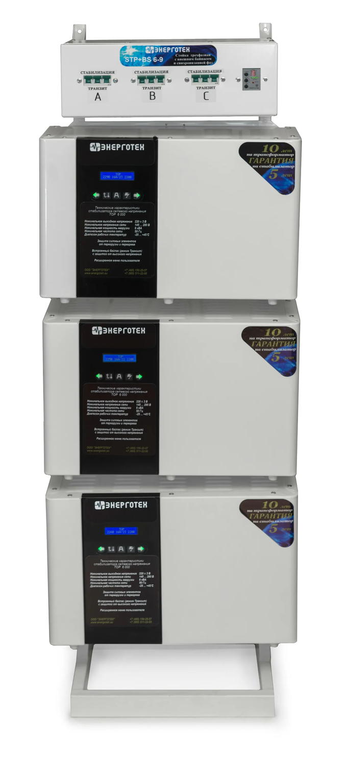Трехфазный стабилизатор напряжения серии PRIME 15000х3 состоит из трех однофазных стабилизаторов напряжения по 15000, подключенных по схеме «звезда» и смонтированных на монтажной стойке. Такое конструктивное исполнение обеспечивает: удобный и компактный монтаж стабилизаторов; быстрое подключение, возможность оперативной замены любого стабилизатора, либо отключение для осуществления ремонта в сервисном центре ; время обесточенного состояния нагрузки при использовании внешнего байпаса не более 1 минуты; защиту от пропадания, асимметрии и нарушения порядка чередования фаз для трехфазных нагрузок; бесперебойную работу однофазных нагрузок, при пропадании напряжения на соседней фазе; отображение на индикаторе входного напряжения и тока, ступени стабилизации и выходного напряжения; Общие технические характеристик трехфазного стабилизатора, полученного при объединении на Стойке трех стабилизаторов PRIME: Тип стабилизатора: Электронный с тиристорной коммутацией Номинальная мощность нагрузки: 45000, ВА Номинальный диапазон входного (сетевого) напряжения * фазного / линейного: 140 ÷ 290 / 242 ÷ 502, В Предельно допустимый диапазон входного (сетевого) напряжения фазного / линейного: 120 ÷ 310 / 208 ÷ 537, В Номинальное выходное напряжение (по умолчанию) ** фазное / линейное: 220 / 380, В Точность стабилизации: ± 3,0, % Максимально допустимое отклонение выходного (стабилизированного) напряжения от номинального фазного / линейного: ± 6 / ± 10, В Число ступеней автоматического регулирования: 20 Допустимая кратковременная перегрузка (в течение 10 сек) / (в течение 0,5 сек): 120 / 200, % КПД, не менее: 0,97 Номинальная частота питающей сети: 50, Гц Класс защиты: IP 20 (негерметизирован) Климатическое исполнение: УХЛ 4.2 * диапазон сетевого напряжения, в пределах которого стабилизатор обеспечивает заявленную точность стабилизации и мощность подключенной нагрузки. ** может быть изменено пользователем в пределах от 200 В до 230 В. В случае изменения значения номинального выходного напряжения, пределы максимального отклонения выходного напряжения будут также сдвинуты.