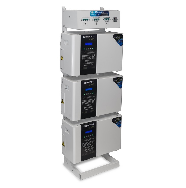 Трехфазный стабилизатор напряжения серии PRIME 27000 (9000х3) состоит из трех однофазных стабилизаторов напряжения по 9000 ВА, подключенных по схеме «звезда» и смонтированных на монтажной стойке. Устройство предназначено для непрерывного использования в общественных местах, в жилых, коммерческих и производственных зонах. Тип стабилизатора: Электронный с тиристорной коммутацией Номинальная мощность нагрузки: 27000, ВА Номинальный диапазон входного (сетевого) напряжения фазного: 140 ÷ 290, В; линейного: 242 ÷ 502, В Предельно допустимый диапазон входного (сетевого) напряжения фазного: 120 ÷ 310, В; линейного: 208 ÷ 537, В Номинальное выходное напряжение (по умолчанию) ** фазное: 220, В линейное: 380, В Точность стабилизации: ± 3,0, % Максимально допустимое отклонение выходного (стабилизированного) напряжения от номинального фазного: ± 6, В; линейного: ± 10, В Число ступеней автоматического регулирования: 20 Допустимая кратковременная перегрузка (в течение 10 сек): 120, %; (в течение 0,5 сек): 200, % КПД, не менее: 0,97 Номинальная частота питающей сети: 50, Гц Класс защиты: IP 20 (негерметизирован) Климатическое исполнение: УХЛ 4.2 Температуре окружающей среды от -25 до +45 °C; Относительной влажности до 80% (при 25°C); Атмосферном давлении от 630 до 800 мм рт. ст.ст. При использовании обеспечивается: удобный и компактный монтаж стабилизаторов ; быстрое подключение, возможность оперативной замены любого стабилизатора, либо отключение для осуществления ремонта в сервисном центре ; время обесточенного состояния нагрузки при использовании внешнего байпаса не более 1 минуты; защиту от пропадания, асимметрии и нарушения порядка чередования фаз для трехфазных нагрузок; бесперебойную работу однофазных нагрузок, при пропадании напряжения на соседней фазе; возможность, при необходимости, объединения стабилизаторов разной мощности и точности; задержку на отключение трехфазной нагрузки после пропадания напряжения на одной из фаз 3 секунды; задержку на включение трехфазной нагрузки после восстановления напряжения на всех трех фазах 5 секунд; защиту трехфазной нагрузки в режиме транзит от выхода напряжения за границы диапазона 180 260 В; Внутри блока расположен Контактор, который подает напряжение на трехфазный выход только при условии нахождения всех трех фаз в нормальном состоянии (определяется настройками реле). При работе всех трех стабилизаторов в режиме стабилизации реле контролирует только пропадание фаз. Нормальное функционирование стабилизатора будет происходить при нахождении верхнего переключателя реле в режиме «380», ЧФ в режиме «ВЫКЛ», ПФ, Umin и Umax в режиме «ВКЛ», Uном = 10%, Твкл и Тср в средних положениях. При переключении одного из блоков в режим «Транзит», реле может отключить выход при сильном отклонении напряжения на нестабилизированной фазе. Для более тонкой настройки порогов и задержек, рекомендуется обратится к руководству по эксплуатации реле РНПП311М (прилагается). Для однофазных нагрузок на стойке предусмотрены несинхронизированные выходы, которые не отключаются контактором. Стабилизаторы напряжения ЭНЕРГОТЕХ произведены на основе автотрансформатора с медной обмоткой и качественных мощных силовых ключей, имеют хорошие технические показатели и высокий уровень надежности. Стабилизатор собран в металлическом корпусе с возможностью эксплуатации его в трех различных пол