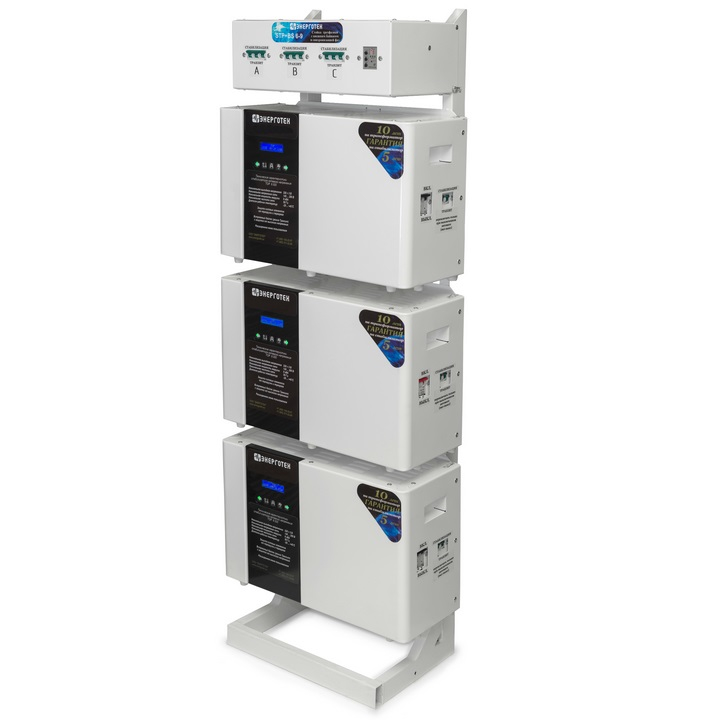 Трехфазный стабилизатор напряжения Энерготех TOP 15000х3 состоит из трех однофазных стабилизаторов напряжения по 15000 ВА, подключенных по схеме «звезда» и смонтированных на монтажной стойке. Такое конструктивное исполнение обеспечивает: удобный и компактный монтаж стабилизаторов; быстрое подключение, возможность оперативной замены любого стабилизатора, либо отключение для осуществления ремонта в сервисном центре; время обесточенного состояния нагрузки при использовании внешнего байпаса не более 1 минуты; защиту от пропадания, асимметрии и нарушения порядка чередования фаз для трехфазных нагрузок; бесперебойную работу однофазных нагрузок, при пропадании напряжения на соседней фазе; отображение на индикаторе входного напряжения и тока, ступени стабилизации и выходного напряжения; Общие технические характеристик трехфазного стабилизатора, полученного при объединении на Стойке трех стабилизаторов TOP: Номинальная мощность нагрузки: 45000, ВА Тип стабилизатора: Электронный с тиристорной коммутацией Номинальный диапазон входного (сетевого) напряжения * фазного / линейного: 145 ÷ 280, В / 251 ÷ 485, В Предельно допустимый диапазон входного (сетевого) напряжения фазного / линейного: 125 ÷ 305, В / 216 ÷ 528, В Номинальное выходное напряжение (по умолчанию) ** фазное / линейное : 220, В / 380, В Точность стабилизации : ± 1,5, % Максимально допустимое отклонение выходного (стабилизированного) напряжения от номинального фазного / линейного: ± 3, В / ± 5, В Число ступеней автоматического регулирования: 36 Допустимая кратковременная перегрузка (в течение 10 сек) / (в течение 5 сек) / (в течение 1 сек): 150, % / 200, % / 400, % КПД, не менее 0,97 Номинальная частота питающей сети: 50, Гц Класс защиты: IP 20 (негерметизирован) Климатическое исполнение: УХЛ 4.2 * диапазон сетевого напряжения, в пределах которого стабилизатор обеспечивает заявленную точность стабилизации и мощность подключенной нагрузки. ** может быть изменено пользователем в пределах от 200 В до 230 В. В случае изменения значения номинального выходного напряжения, пределы максимального отклонения выходного напряжения будут также сдвинуты.
