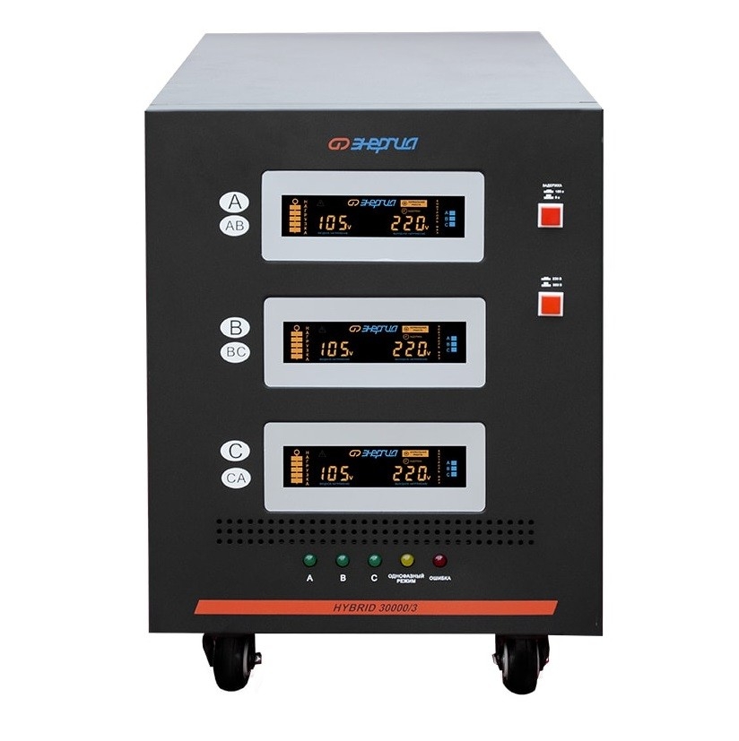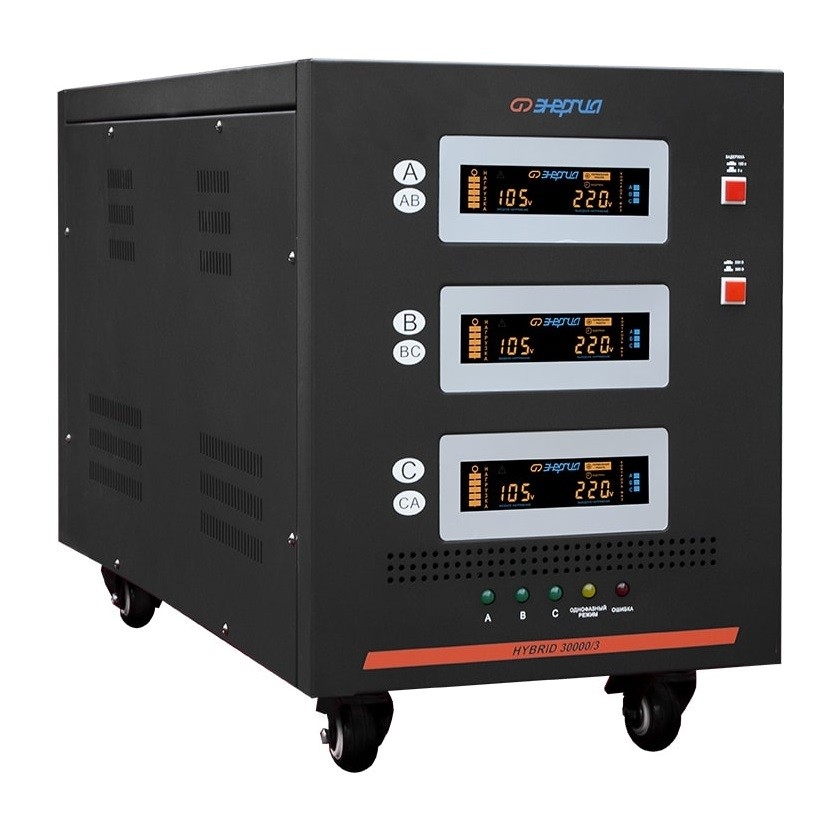 Тип напряжения: Трехфазный Принцип стабилизации: Гибрид, Сервоприводный Мощность (кВА): 30 Максимальный ток (А): до 45 (фазный) Режим работы: Непрерывный Способ установки: Напольный Тип охлаждения: Воздушное (конвекционное и принудительное) Дисплей: LED-дисплей Индикация: Многофункциональная Режим "БАЙПАС": Есть Задержка включения: 6 секунд, 180 секунд Предельный диапазон входных напряжений (В): 80-275 (фазный) Рабочий диапазон входных напряжений (В): 100-260 (фазный) Номинальное выходное напряжение (В): 220/380 Отклонение выходных напряжений: ±3% Скорость регулирования (В/сек): 20 Допустимая кратковременная перегрузка не более (%): 150 Защита от повышенного напряжения, откл. при: 275В Защита от пониженного напряжения, откл. при: 80В Защита от перегрева трансформатора, откл. при: 120 °С Защита от перегрузки по току: Автоматический выключатель (электронная) Защита от перегрузки на пониженном напряжении: Автоматический предохранитель Контроль обрыва фаз: Есть Контроль перекоса фаз: Есть Контроль чередования фаз: Есть Степень защиты от внешних воздействий по ГОСТ 14254-96: IP20 Температура эксплуатации (°С): -10...+45 Температура хранения (°С): -40...+45 Относительная влажность (%): 95 КПД при полной нагрузке (%): 98 Габаритные размеры (мм): 700x350x500 Вес (кг): 84 Вес брутто (кг): 105 Производитель: Энергия Cтрана производства: Россия Гарантия: 12 месяцев Расчетный срок службы: 10 лет Применение: Для частного дома, Для промышленных нужд Энергия Hybrid II-го поколения - совершенно новый трехфазный стабилизатор от отечественного производителя. Основной принцип работы электромеханический - напряжение регулирует плавно и без разрыва фазы, но выдерживает просадки до 80 вольт на фазе, а погрешность выходного напряжения не превышает 3% при скачках от 100 до 260 вольт. Поверхность платы управления обработана специальным составом, что позволяет стабилизатору напряжения функционировать при отрицательных температурах. Оборудован многофункциональным LED-дисплеем с расширенной индикацией для отображения уровня нагрузки, входного/выходного напряжения, задержки включения и ошибок сети. Отличное решение для применения как в частных домах так и на производстве. При работе с трехфазными потребителями защищает от перекоса и пропадания фаз. Есть возможность переключения в однофазный режим работы в случае аварии на одной из фаз возможность включения однофазного режима, при котором регулировка напряжения происходит независимо, по фазам, что дает возможность сохранить питание однофазных потребителей при пропадании одной или двух фаз. Разработан новый блок питания платы управления: питающее напряжение сервомотора и других важных модулей стабилизатора перестало зависеть от колебаний напряжения в сети, что благоприятно сказалось на надежности, скорости реагирования и обеспечило стабильный крутящий момент электродвигателя.