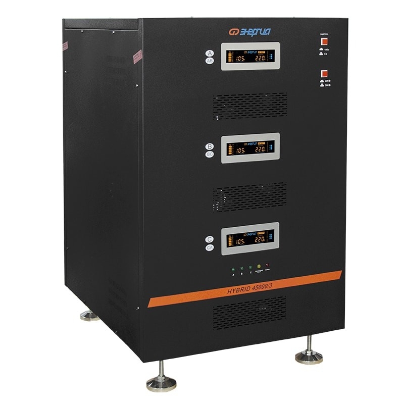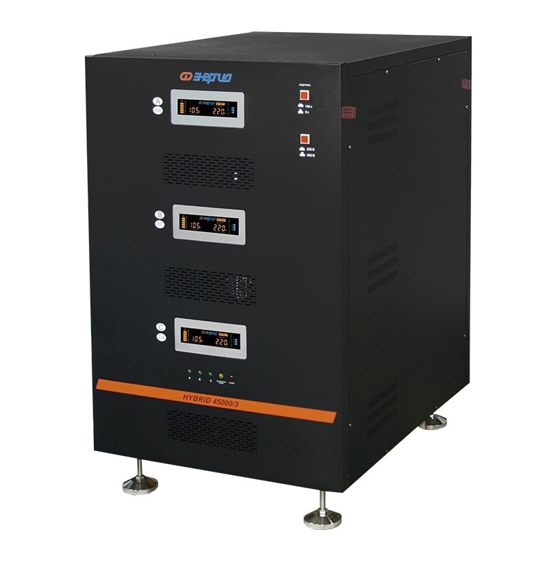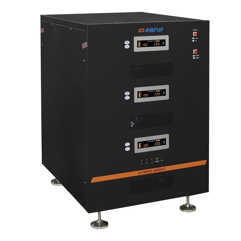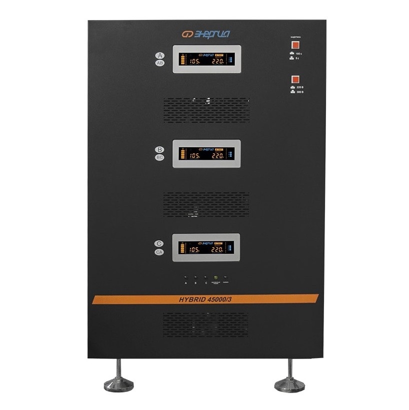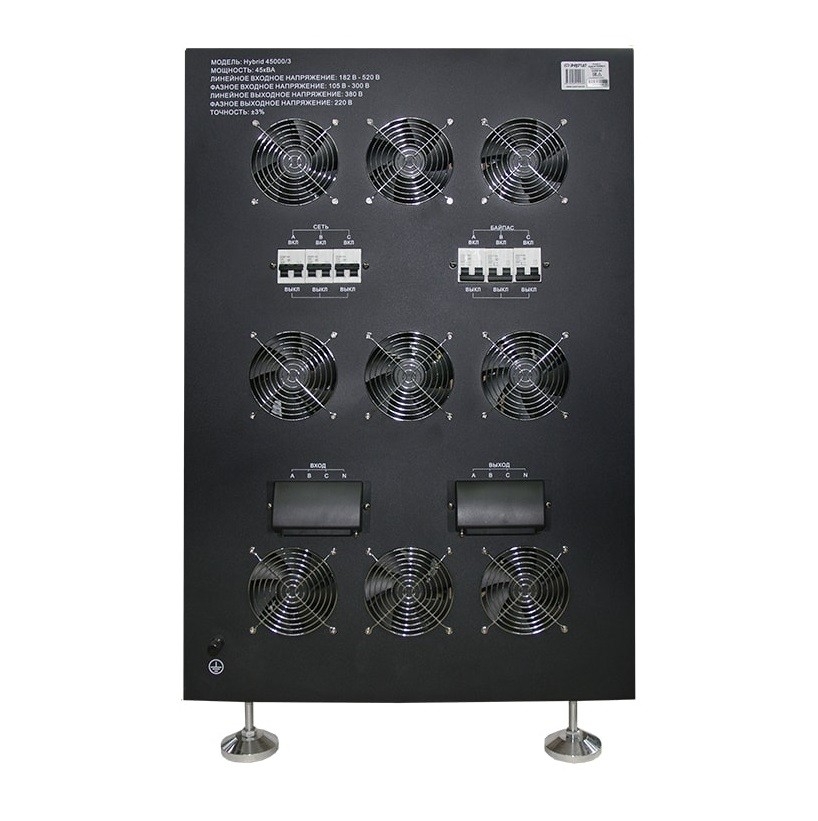 Тип напряжения: Трехфазный Принцип стабилизации: Сервоприводный Мощность (кВА): 45 Максимальный ток (А): до 68 (фазный) Режим работы: Непрерывный Способ установки: Напольный Тип охлаждения: Воздушное (конвекционное и принудительное) Дисплей: LED-дисплей Индикация: Многофункциональная Подключение: Клеммная колодка Режим "БАЙПАС": Есть Задержка включения: 180 секунд, 6 секунд Предельный диапазон входных напряжений (В): 80-275 (фазный) Рабочий диапазон входных напряжений (В): 100-260 (фазный) Номинальное выходное напряжение (В): 220/380 Отклонение выходных напряжений: ±3% Скорость регулирования (В/сек): 20 Допустимая кратковременная перегрузка не более (%): 150 Защита от повышенного напряжения, откл. при: 275В Защита от пониженного напряжения, откл. при: 80В Защита от перегрева трансформатора, откл. при: 120 °С Защита от перегрузки по току: Автоматический выключатель (электронная) Защита от перегрузки на пониженном напряжении: Автоматический предохранитель Контроль обрыва фаз: Есть Контроль перекоса фаз: Есть Контроль чередования фаз: Есть Степень защиты от внешних воздействий по ГОСТ 14254-96: IP20 Температура эксплуатации (°С): -10...+45 Температура хранения (°С): -40...+45 Относительная влажность (%): 95 КПД при полной нагрузке (%): 98 Габаритные размеры (мм): 752х600х970 Вес (кг): 247 Вес брутто (кг): 276 Гарантия: 12 месяцев Расчетный срок службы: 10 лет Применение: Для промышленных нужд, Для частного дома Моноблочная компоновка, регулируемые ножки. Давайте представим, что этот стабилизатор выполнен не в виде «моноблока», а в виде трех настенных аппаратов. В таком случае их потребовалось бы монтировать по отдельности, что отняло бы очень много времени. Моноблочный же аппарат, пусть он весит немало, достаточно поставить на место и подключить. При наличии гидравлической тележки задача упрощается в разы. Эта модель оборудована регулируемыми ножками, которые обеспечивают устойчивое положение даже на неровной поверхности. Встроенный блок контроля фаз. Работа трехфазной сети должна контролироваться в обязательном порядке. Однако для этого стабилизатора вам не придется докупать специальный контролирующий блок он уже встроен в аппарат. Модуль контроля сети обеспечит защиту оборудования, если случится обрыв фазы, нарушится очередность фаз или обнаружится несимметрия напряжения. Очень высокая мощность (45 кВА), хорошая нагрузочная способность. Данная модель способна обеспечить работу, в частности, очень мощных станков, компрессоров или холодильных установок на промышленном предприятии. Предел нагрузки для этого аппарата 36 кВт (если имеется реактивная составляющая) или 45 кВт в случае, если нагрузка чисто активная. Маленькая погрешность стабилизации. Она не превышает трех процентов в большую или меньшую сторону, что дает возможность подключать устройства, очень чувствительные к отклонению вольтажа от нормы. При такой точности выходной линейный вольтаж находится в рамках 369-391 В. Большой диапазон входных напряжений. Трехпроцентная погрешность стабилизации гарантирована в очень большом диапазоне сетевых фазных напряжений от 100 до 260 В. Питание нагрузки модель обеспечивает при фазных напряжениях от 80 до 275 вольт. В общем, аппарат без проблем уживается даже с сильно перегруженными сетями. Режим «220 В». Если в одной из фаз происходит сбой, эксплуатировать 380-вольтовое оборудование нельзя. Тре