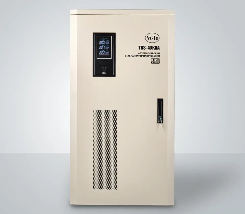 VoTo TNS 40000/3 ВА- трехфазный электромеханический стабилизатор напряжения как для промышленного так и для частного использования коттеджей и не больших предприятий. Мощность: 40000 ВА Рабочий диапазон: 250-450В Выходное напряжение: 380В ± 3% Количество фаз: Трехфазный Рабочая частота: 50-60 Гц Влажность окружающей среды: не более 90% КПД: 97% Защита от повышенной нагрузки: Присутствует Защита от повышенного напряжения: Присутствует Защита от пониженного напряжения: Присутствует Защита от короткого замыкания: Присутствует Термозащита трансформатора: Присутствует Тип размещения Напольный Вес: 170кг