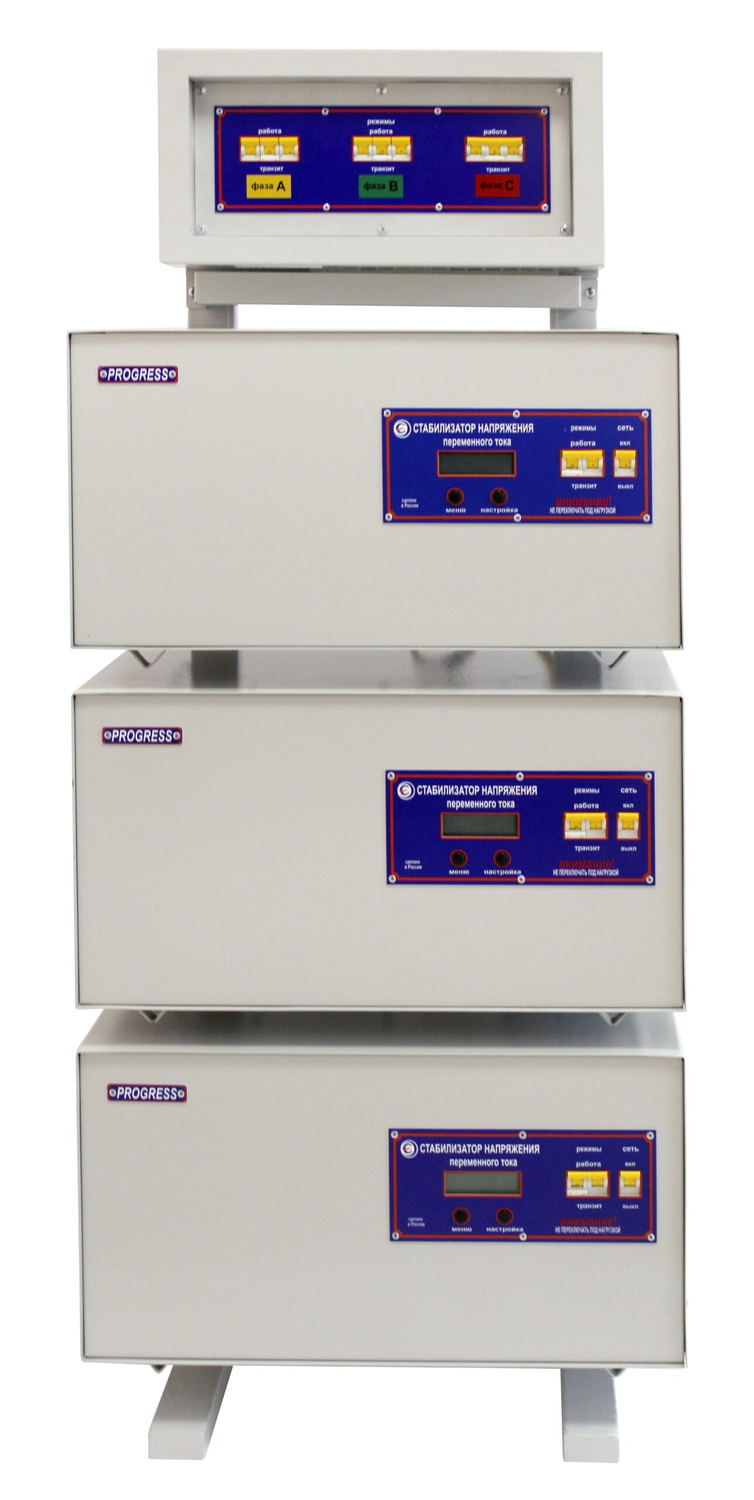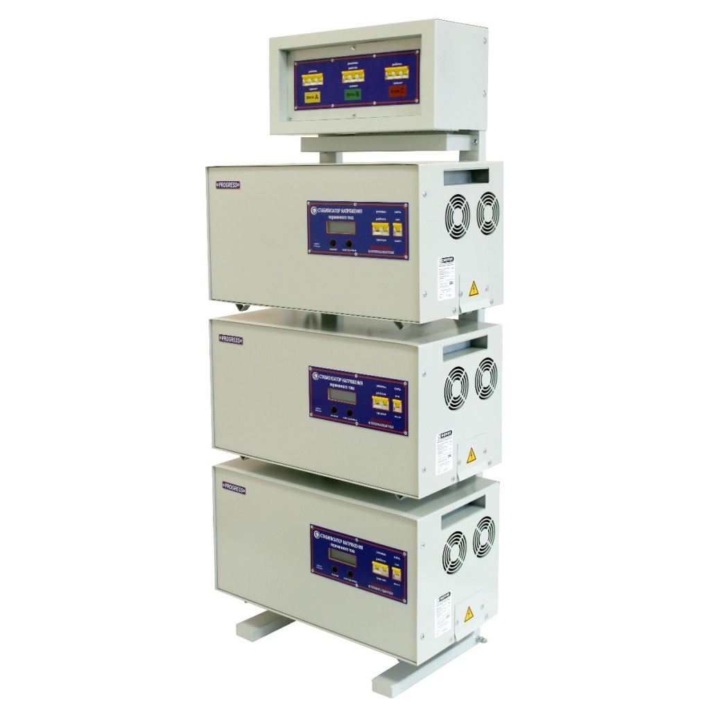 Комплект их трех однофазных стабилизаторов напряжения PROGRESS 12000Т-30 и стойки PROGRESS 24-36 с Байпасом. Отличное решение квартир, частных домах, офисных помещениях, гаражей и небольших мастерских для подключения бытового электрооборудования и садового электроинструмента. Тип: тиристорный (ступенчатый с электронной коммутацией) Количество фаз: Три Мощность, ВА: 36000 Диапазон входных напряжений (рабочий), В: 260 - 458 Диапазон входных напряжений(предельный), В: 225 - 476 Процент отклонения выходного напряжения, %: ±4,5 Выходное напряжение, В: 380 Входная частота, Гц: 50 ±0,4 КПД не менее, %: 98 Перегрузочная способность: 10% в течение 10 секунд Уровень шума, dB: < 40 dB на расстоянии 1 м Напряжение цепи постоянного тока, В: 380 Форма выходного сигнала: не ис Относительная влажность, %: Не более 80% при 25° С без конденсата Климатическое исполнение: УХЛ 3 Класс защиты: IP 21 Диапазон температуры окружающей среды,°С: -45...+45 Габариты, мм: 1230 х 460 х 290; Масса, кг: 115 Дополнительно: Управление: микропроцессорное. Отклик на возмущение, мс: не более 20. Скорость регулирования, В/с: не менее 500. Мощность на холостом ходу, Вт: в зависимости от мощности стабилизатора от 12 до 45. Индикация: двухстрочный ЖКИ - Uвх,Uвых, Рнаг, авария и её причина в сети, в нагрузке, в стабилизаторе. Защита: от перегрузки по току, повышенного/пониженного напряжения, от помех. Дополнительная защита: автоматический выключатель с тепловой и электромагнитной отсечкой. Охлаждение: принудительное, автоматическое. PROGRESS - это надежность проверенная временем! Почти три десятка лет продукция компании радует своих пользователей.