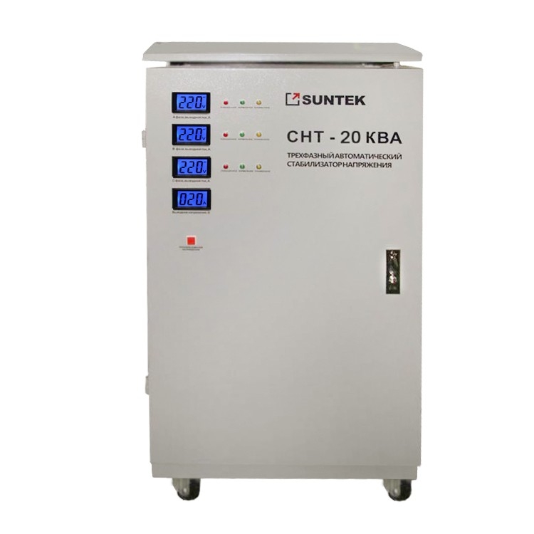 Стабилизатор трехфазный SUNTEK СНТ используется для защиты оборудования, установленного на промышленных объектах, в частных домах, дачах, от перепадов напряжения и короткого замыкания. Стабилизатор поддерживает широкий диапазон входного напряжения и отключается только при выходе за рамки фазного 120-285 Вольт. Номинальная мощность, ВА: 20000 Максимальный ток, А: 90 Рабочий диапазон входных напряжений, В: 120 - 285 фазное и 240 - 450 линейное Ном. диапазон выходного напряжения, В: 215-225 фазное и 365 - 395 линейное Тип стабилизации: электромеханический ( сервопривод) Погрешность выходного напряжения,%: 2 на фазном и 4 на линейном Регулировка: плавная, автоматическая Искажение синусоиды: отсутствует Вариант подключения: клеммная колодка Рабочий диапазон t°С: -5 - +40 Охлаждение: пассивное Способ подключения в сеть: клеммная колодка Потребляемый ток, А: - Корпус: металл Защита от к/з: + Грозозащита: - Минимальная розничная цена, руб.: 54600 Габаритные размеры д-ш-в, см: 63х60х96 Вес, кг.: 75