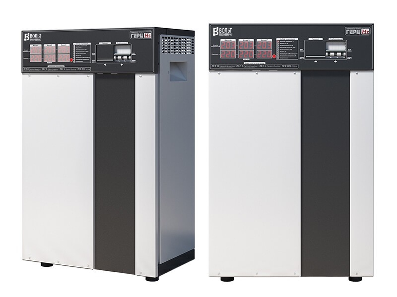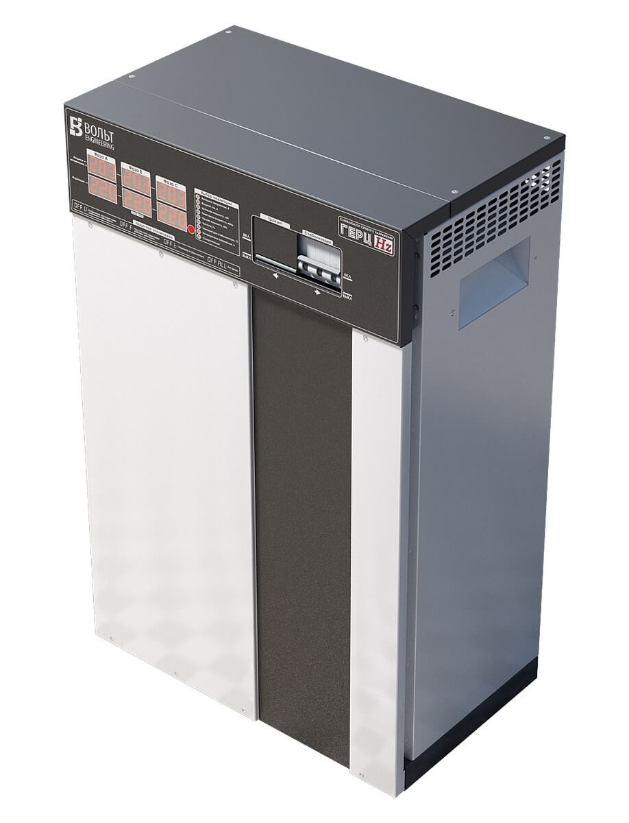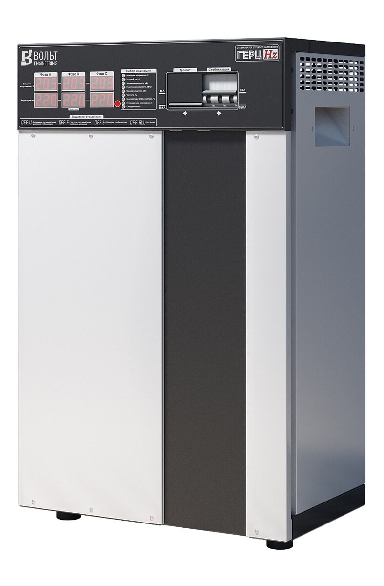 Трехфазный стабилизатор напряжения Герц V3.0 идеален для защиты от нестабильности в электросети как производственной линии, так и частного дома или даже жилого комплекса. Предназначен для работы в электрических сетях с колебаниями напряжения от 150 до 260В. В этом диапазоне аппарат гарантированно выдает на выходе напряжение в рамках 220±2.5%, что обеспечивается за счет использования 16 ступеней стабилизации соответственно. Номинальный ток, А: 3×50 Номинальная мощность, кВА/кВт: 33.0 Количество ступеней стабилизации: 16 Тип ключа: тиристор КПД стабилизатора, не ниже, %: 98 Потребляемая активная мощность на холостом ходу, не более, Вт: 20 Номинальное выходное напряжение, В: 220 Диапазон стабилизации в рамках заявленной точности поддержания выходного напряжения, В: 150 260 Диапазон работы, В: 100 280 Пределы подстройки выходного напряжения, В: нет Точность поддержания выходного напряжения в диапазоне стабилизации, %: 2,5 Защита от неполнофазного режима: есть Время реакции на изменение входного напряжения, мс: 20 Частота питающей сети, Гц: 45 65 Измерение входного тока, активной, реактивной и полной мощности: есть Ограничение токов КЗ и перегрузки: Входной автоматический выключатель с С-характеристикой электромагнитной защиты Индикация: 2 графических LED индикатора на фазу Механический Байпас: есть Микроконтроллерное управление: есть Анализатор сети и состояния стабилизатора: есть Принудительное охлаждение: вентилятор Дублирующая защита от перенапряжений: есть Входной дроссель: нет Выходной дроссель: есть Защита от перегрева: есть Минимальное сечение жил кабеля для подключения, мм2: 10 Максимальное сечение жил кабеля для подключения, мм2: 40 Вид климатического исполнения: УХЛ категория 4.2 Габаритные размеры, не более, мм: 725 х 480 х 310 Масса, не более, кг: 77 К особенностям данного стабилизатора можно отнести двойной LED-индикатор на фазу, линейная полоса загрузки, наличие механического транзита (байпас), напольное исполнение, наличие входных и выходных фильтров для защиты от высокочастотных помех, бесшумную работу за счет использования тороидальных трансформаторов и тиристорных ключей. При необходимости получить на выходе стабилизатора напряжение отличное от 220В в Герц имеется функция регулировки данного значения в диапазоне 200-230В. В ручном режиме можно поменять напряжение на выходе с шагом 1В. При это изменения будут применяться одновременно ко всем фазам. высочайшая точность стабилизации выходного напряжения; разделенное микроконтроллерное управление (4 микропроцессора); высоконадежное трансформаторное управление ключами; минимально возможное время реакции на изменение входного напряжения; бесшумный силовой тороидальный трансформатор; не искажает форму выходного напряжения; низкое собственное потребление электроэнергии на холостом ходу; система охлаждения с использованием мощного игольчатого охладителя ключей и вентиляторов; возможность изменения выходного напряжения в пределах 200-230 В и нижнего порога входного напряжения 60-135В; высокоточное RMS-измерение входного напряжения; наличие анализатора сети и состояния стабилизатора; возможность работы от бензо/дизель-генераторных установок; наличие механического байпаса; система защиты ключей и трансформатора от перегрева; Стабилизатор Герц имеет возможность ручной подстройки нижнего порога от