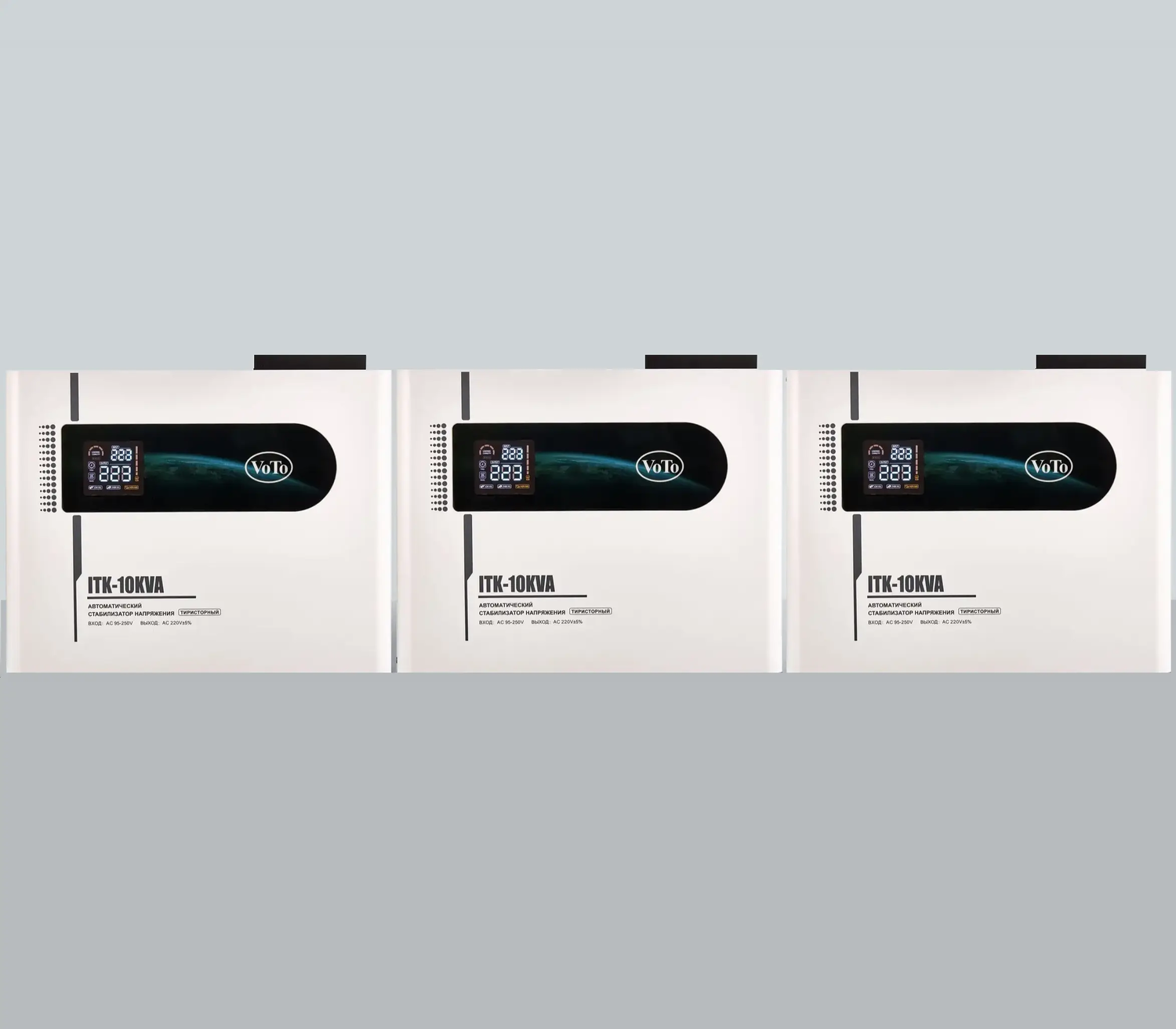 Трехфазный тиристорный стабилизатор напряжения VoTo ITK - 30 кВА конструктивно состоит из трех однофазных стабилизаторов напряжения VoTo ITK - 10000 и предназначен для подключения в трехфазную сеть общей мощностью до 30кВА. Отличное решение для подключения в трехфазную сеть частного домовладения - максимальная трехфазная нагрузка 30 кВА, будет достаточно даже при сильных падениях напряжения в сети а компактные размеры и настенная конструкция позволит грамотно разместить устройство в условиях дефицита свободного пространства. Преимущества: высокая скорость регулировки (10-20 мс) – подходит для чувствительной техники; бесшумность (нет механических реле, как в релейных стабилизаторах); долговечность (тиристоры не имеют изнашивающихся контактов); плавная регулировка (ступенчатая, но с большим количеством ступеней, чем у релейных). Тип стабилизатора: тиристорный Тип сети: однофазная Серия стабилизатора: ITK Полная мощность: 30000 (10000х3), ВА Способ установки: напольный, настенный Подключение: клеммная колодка Режим "БАЙПАС": есть Отклонение выходных напряжений: ±5, % Режим работы: непрерывный Тип охлаждения: воздушное (конвекционное и принудительное) Дисплей: LED-дисплей Индикация: входное напряжение / выходное напряжение / сеть / защита / задержка Задержка включения: 200, 5, сек Предельный диапазон входных напряжений, по каждой из фаз: 80-270, В Рабочий диапазон входных напряжений, по каждой из фаз: 95-250, В Частота: 50-60, Гц Номинальное выходное напряжение: 380 (220х3), В Время реакции на изменение напряжения: 30, мс Защита от повышенного напряжения, по каждой из фаз, откл. при: 247±4, В Защита от пониженного напряжения,, по каждой из фаз откл. при: 170±4, В Защита от перегрева трансформатора,, по каждой из фаз откл. при: 120, °С Защита от перегрузки по току: Автоматический выключатель (электронная) Степень защиты от внешних воздействий по ГОСТ 14254-96: IP20 Относительная влажность: 0 - 80, % (без конденсата) КПД при полной нагрузке:95, % Температура хранения: -30...+80, °C Температура эксплуатации: -20...+40, °С Родина бренда: Россия Страна производства: Китай Вес: 87 (29х3), кг Размеры: 3х(440x340x180), мм Благодаря бесшумной корректировки напряжения, стабилизаторы отлично подойдут для установки в жилые помещения, в том числе не отапливаемые. Применяются для установки в дома и офисы (для защиты бытовой техники), в промышленности (станки, серверное оборудование) и для защиты требовательной техники (медицинская, асик майнеры и другая, где важно быстрое реагирование).