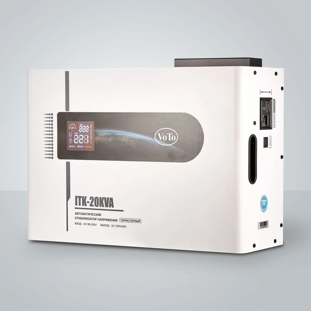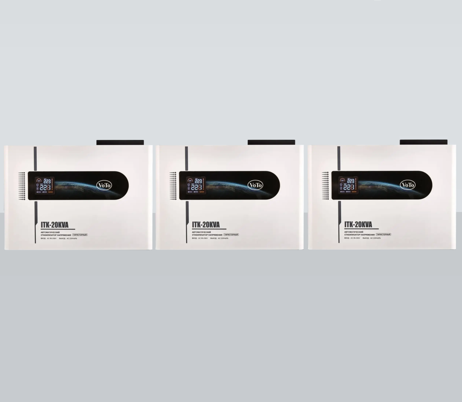 Трехфазный тиристорный стабилизатор напряжения VoTo ITK - 60 кВА конструктивно состоит из трех однофазных стабилизаторов напряжения VoTo ITK - 20000 и предназначен для подключения в трехфазную сеть общей мощностью до 60кВА, достаточно, чтобы запитать крупное домовладение или промышленный объект а компактные размеры и настенная конструкция позволит грамотно разместить устройство в условиях дефицита свободного пространства. Тиристорный стабилизатор напряжения VoTo оснащен комплексом систем, обеспечивающим надежную защиту потребителей, от пониженного и повышенного напряжения, от перегрузки по току и короткому замыканию. Устройство оснащено информационным дисплеем, отображающим в реальном времени все текущие показатели в электрической сети. Преимущества: высокая скорость регулировки (10-20 мс) – подходит для чувствительной техники; бесшумность (нет механических реле, как в релейных стабилизаторах); долговечность (тиристоры не имеют изнашивающихся контактов); плавная регулировка (ступенчатая, но с большим количеством ступеней, чем у релейных). Тип стабилизатора: тиристорный Тип сети: однофазная Серия стабилизатора: ITK Полная мощность: 60000 (20000х3), ВА Способ установки: напольный, настенный Подключение: клеммная колодка Режим "БАЙПАС": есть Отклонение выходных напряжений: ±5, % Режим работы: непрерывный Тип охлаждения: воздушное (конвекционное и принудительное) Дисплей: LED-дисплей Индикация: входное напряжение / выходное напряжение / сеть / защита / задержка Задержка включения: 200, 5, сек Предельный диапазон входных напряжений, по каждой из фаз: 80-270, В Рабочий диапазон входных напряжений, по каждой из фаз: 95-250, В Частота: 50-60, Гц Номинальное выходное напряжение: 380 (220х3), В Время реакции на изменение напряжения: 30, мс Защита от повышенного напряжения, по каждой из фаз, откл. при: 247±4, В Защита от пониженного напряжения,, по каждой из фаз откл. при: 170±4, В Защита от перегрева трансформатора,, по каждой из фаз откл. при: 120, °С Защита от перегрузки по току: Автоматический выключатель (электронная) Степень защиты от внешних воздействий по ГОСТ 14254-96: IP20 Относительная влажность: 0 - 80, % (без конденсата) КПД при полной нагрузке: 95, % Температура хранения: -30...+80, °C Температура эксплуатации: -20...+40, °С Вес: 117 (39х3), кг Размеры: 3х(520x360x200), мм Благодаря бесшумной корректировки напряжения, стабилизаторы отлично подойдут для установки в жилые помещения, в том числе не отапливаемые. Применяются для установки в дома и офисы (для защиты бытовой техники), в промышленности (станки, серверное оборудование) и для защиты требовательной техники (медицинская, асик майнеры и другая, где важно быстрое реагирование).