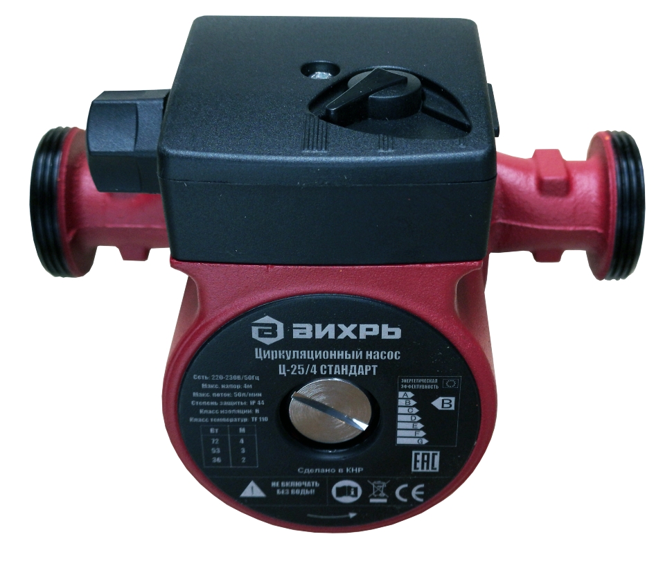 Ассортимент циркуляционных насосов пополнился новой бюджетной линейкой СТАНДАРТ с гарантийным сроком обслуживания 1 год, при этом качество насосов остается на высоком уровне. Частота, Гц: 50 Материал: Алюминий Давление, бар: 10 10 Напряжение сети, В: 220 Гарантия, мес.: 12 Страна бренда: Россия Страна производства: Китай Комплектация: Циркуляционный насос 1 шт. Сгон с накидной гайкой 2 шт. Резиновые прокладки 2 шт. Паспорт 1 шт. Упаковка 1 шт. Вес в упаковке: 3 кг Класс защиты: IP44 Бренд: Вихрь Максимальный поток, л/мин: 50 Класс изоляции: Н Класс температур: TF 110 Материал крышки насоса: Чугун Материал корпуса двигателя: Алюминий Размер резьбы на насосе: 1,5 дюйма Размер соединительной гайкипереходника: 1 дюйм Мощность, Вт 1 скорость: 36 Мощность, Вт 2 скорость: 53 Мощность, Вт 3 скорость: 72 Напор, м 1 скорость: 2 Напор, м 2 скорость: 3 Напор, м 3 скорость: 4 Модель: ЦН-25-4 Циркуляционный насос ВИХРЬ ЦН-25-4 предназначен для обеспечения циркуляции воды в системах отопления, круговых трубопроводах горячего и холодного водоснабжения, центральных отопительных установках и системах перекачки промышленных вод (системах кондиционирования, охлаждения). Насос представляет собой компактное устройство с всасывающей и нагнетающей функциями. Вода перекачивается при помощи вращения рабочего колеса электродвигателем насоса. Данный вид насосов надёжен, экономичен и прост в использовании. Крышка насоса изготовлена из чугуна, рабочее колесо из полимерных материалов, корпус электродвигателя из алюминия. Насос имеет три скорости работы, выбираемые ручным переключением вращающейся ручки на клеммной коробке. Охлаждение и смазка керамических подшипников осуществляется перекачиваемой жидкостью. Заглушка ротора позволяет удалять остатки воздуха из системы путём её откручивания и стравливания воздуха. В комплектацию не входит кабель подключения к сети. Следует использовать термостойкий трехжильный кабель с поперечным сечением каждой жилы не менее 0,75 мм2 и с резиновой изоляцией. В названии циркуляционных насосов Вихрь отражены два параметра, например: Ц-25/4. Первые две цифры это диаметр присоединительных патрубков. В нашем случае 25 мм (1 дюйм) диаметр резьбы гаек, поставляемых в комплекте с циркуляционным насосом. Он должен соответствовать диаметру труб (переходников) в системе отопления. В системах отопления наиболее распространены два диаметра - 25 и 32 мм. Второе число обозначает максимальный напор насоса. В нашем примере максимальный напор составляем 4 м, то есть он может создавать избыточное давление до 0,4 атм. Этот параметр должен превышать расчетный напор требуемый для системы отопления. Пример упрощенного расчета требуемого напора будет приведен ниже. Потребляемая мощность циркуляционных насосов регулируется ступенчато (3 положения). Мощность и максимальный напор для каждой ступени указан в таблице на корпусе насоса. Кабель питания подключается к клеммной колодке и в комплект не входит. Преимущества: - бесшумная работа, - установка непосредственно на трубопроводе, - малые габаритные размеры, - большой срок эксплуатации, - регулировка скорости перекачки жидкости.