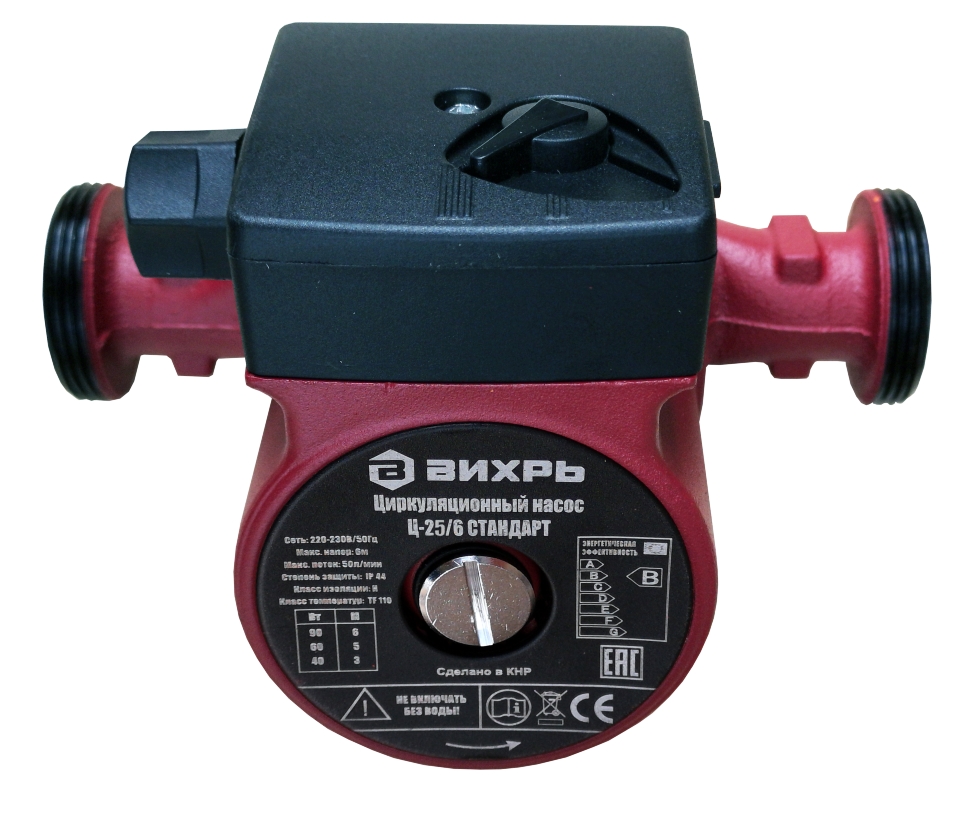 Ассортимент циркуляционных насосов пополнился новой бюджетной линейкой СТАНДАРТ с гарантийным сроком обслуживания 1 год, при этом качество насосов остается на высоком уровне. Частота, Гц: 50 Материал: Алюминий Давление, бар: 10 10 Напряжение сети, В: 220 Гарантия, мес.: 12 Страна бренда: Россия Страна производства: Китай Комплектация: Циркуляционный насос 1 шт. Сгон с накидной гайкой 2 шт. Резиновые прокладки 2 шт. Паспорт 1 шт. Упаковка 1 шт. Вес в упаковке: 3 кг Класс защиты: IP44 Бренд: Вихрь Максимальный поток, л/мин: 50 Класс изоляции: Н Класс температур: TF 110 Материал крышки насоса: Чугун Материал корпуса двигателя: Алюминий Размер резьбы на насосе: 1,5 дюйма Размер соединительной гайкипереходника: 1 дюйм Мощность, Вт 1 скорость: 40 Мощность, Вт 2 скорость: 60 Мощность, Вт 3 скорость: 90 Напор, м 1 скорость: 3 Напор, м 2 скорость: 5 Напор, м 3 скорость: 6 Модель: ЦН-25/6 Циркуляционный насос ВИХРЬ ЦН-25-6 предназначен для обеспечения циркуляции воды в системах отопления, круговых трубопроводах горячего и холодного водоснабжения, центральных отопительных установках и системах перекачки промышленных вод (системах кондиционирования, охлаждения). Насос представляет собой компактное устройство с всасывающей и нагнетающей функциями. Вода перекачивается при помощи вращения рабочего колеса электродвигателем насоса. Данный вид насосов надёжен, экономичен и прост в использовании. Крышка насоса изготовлена из чугуна, рабочее колесо из полимерных материалов, корпус электродвигателя из алюминия. Насос имеет три скорости работы, выбираемые ручным переключением вращающейся ручки на клеммной коробке. Охлаждение и смазка керамических подшипников осуществляется перекачиваемой жидкостью. Заглушка ротора позволяет удалять остатки воздуха из системы путём её откручивания и стравливания воздуха. В комплектацию не входит кабель подключения к сети. Следует использовать термостойкий трехжильный кабель с поперечным сечением каждой жилы не менее 0,75 мм2 и с резиновой изоляцией. В названии циркуляционных насосов Вихрь отражены два параметра, например: Ц-25/4. Первые две цифры это диаметр присоединительных патрубков. В нашем случае 25 мм (1 дюйм) диаметр резьбы гаек, поставляемых в комплекте с циркуляционным насосом. Он должен соответствовать диаметру труб (переходников) в системе отопления. В системах отопления наиболее распространены два диаметра - 25 и 32 мм. Второе число обозначает максимальный напор насоса. В нашем примере максимальный напор составляем 4 м, то есть он может создавать избыточное давление до 0,4 атм. Этот параметр должен превышать расчетный напор требуемый для системы отопления. Пример упрощенного расчета требуемого напора будет приведен ниже. Потребляемая мощность циркуляционных насосов регулируется ступенчато (3 положения). Мощность и максимальный напор для каждой ступени указан в таблице на корпусе насоса. Кабель питания подключается к клеммной колодке и в комплект не входит. Преимущества: - бесшумная работа, - установка непосредственно на трубопроводе, - малые габаритные размеры, - большой срок эксплуатации, - регулировка скорости перекачки жидкости.