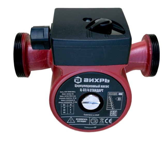 Ассортимент циркуляционных насосов пополнился новой бюджетной линейкой СТАНДАРТ с гарантийным сроком обслуживания 1 год, при этом качество насосов остается на высоком уровне. Частота, Гц: 50 Материал: Алюминий Давление, бар: 10 10 Напряжение сети, В: 220 Гарантия, мес.: 12 Страна бренда: Россия Страна производства: Китай Комплектация: Циркуляционный насос 1 шт. Сгон с накидной гайкой 2 шт. Резиновые прокладки 2 шт. Паспорт 1 шт. Упаковка 1 шт. Вес в упаковке: 3 кг Класс защиты: IP44 Бренд: Вихрь Максимальный поток, л/мин: 50 Класс изоляции: Н Класс температур: TF 110 Материал крышки насоса: Чугун Материал корпуса двигателя: Алюминий Размер резьбы на насосе: 2 дюйма Размер соединительной гайкипереходника: 1,25 дюйм Мощность, Вт 1 скорость: 36 Мощность, Вт 2 скорость: 53 Мощность, Вт 3 скорость: 72 Напор, м 1 скорость: 2 Напор, м 2 скорость: 3 Напор, м 3 скорость: 4 Модель: Ц-32/4 Циркуляционный насос ВИХРЬ Ц-32/4 предназначен для обеспечения циркуляции воды в системах отопления, круговых трубопроводах горячего и холодного водоснабжения, центральных отопительных установках и системах перекачки промышленных вод (системах кондиционирования, охлаждения). Насос представляет собой компактное устройство с всасывающей и нагнетающей функциями. Вода перекачивается при помощи вращения рабочего колеса электродвигателем насоса. Данный вид насосов надёжен, экономичен и прост в использовании. Крышка насоса изготовлена из чугуна, рабочее колесо из полимерных материалов, корпус электродвигателя из алюминия. Насос имеет три скорости работы, выбираемые ручным переключением вращающейся ручки на клеммной коробке. Охлаждение и смазка керамических подшипников осуществляется перекачиваемой жидкостью. Заглушка ротора позволяет удалять остатки воздуха из системы путём её откручивания и стравливания воздуха. В комплектацию не входит кабель подключения к сети. Следует использовать термостойкий трехжильный кабель с поперечным сечением каждой жилы не менее 0,75 мм2 и с резиновой изоляцией. В названии циркуляционных насосов Вихрь отражены два параметра, например: Ц-25/4. Первые две цифры это диаметр присоединительных патрубков. В нашем случае 25 мм (1 дюйм) диаметр резьбы гаек, поставляемых в комплекте с циркуляционным насосом. Он должен соответствовать диаметру труб (переходников) в системе отопления. В системах отопления наиболее распространены два диаметра - 25 и 32 мм. Второе число обозначает максимальный напор насоса. В нашем примере максимальный напор составляем 4 м, то есть он может создавать избыточное давление до 0,4 атм. Этот параметр должен превышать расчетный напор требуемый для системы отопления. Пример упрощенного расчета требуемого напора будет приведен ниже. Потребляемая мощность циркуляционных насосов регулируется ступенчато (3 положения). Мощность и максимальный напор для каждой ступени указан в таблице на корпусе насоса. Кабель питания подключается к клеммной колодке и в комплект не входит. Преимущества: - бесшумная работа, - установка непосредственно на трубопроводе, - малые габаритные размеры, - большой срок эксплуатации, - регулировка скорости перекачки жидкости.