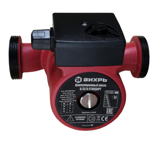 Ассортимент циркуляционных насосов пополнился новой бюджетной линейкой СТАНДАРТ с гарантийным сроком обслуживания 1 год, при этом качество насосов остается на высоком уровне. Частота, Гц: 50 Материал: Алюминий Давление, бар: 10 10 Напряжение сети, В: 220 Гарантия, мес.: 12 Страна бренда: Россия Страна производства: Китай Комплектация: Циркуляционный насос 1 шт. Сгон с накидной гайкой 2 шт. Резиновые прокладки 2 шт. Паспорт 1 шт. Упаковка 1 шт. Вес в упаковке: 3 кг Класс защиты: IP44 Бренд: Вихрь Максимальный поток, л/мин: 50 Класс изоляции: Н Класс температур: TF 110 Материал крышки насоса: Чугун Материал корпуса двигателя: Алюминий Размер резьбы на насосе: 2 дюйма Размер соединительной гайкипереходника: 1,25 дюйм Мощность, Вт 1 скорость: 40 Мощность, Вт 2 скорость: 60 Мощность, Вт 3 скорость: 90 Напор, м 1 скорость: 3 Напор, м 2 скорость: 5 Напор, м 3 скорость: 6 Модель: Ц-32/6 Циркуляционный насос ВИХРЬ Ц-32/6 предназначен для обеспечения циркуляции воды в системах отопления, круговых трубопроводах горячего и холодного водоснабжения, центральных отопительных установках и системах перекачки промышленных вод (системах кондиционирования, охлаждения). Насос представляет собой компактное устройство с всасывающей и нагнетающей функциями. Вода перекачивается при помощи вращения рабочего колеса электродвигателем насоса. Данный вид насосов надёжен, экономичен и прост в использовании. Крышка насоса изготовлена из чугуна, рабочее колесо из полимерных материалов, корпус электродвигателя из алюминия. Насос имеет три скорости работы, выбираемые ручным переключением вращающейся ручки на клеммной коробке. Охлаждение и смазка керамических подшипников осуществляется перекачиваемой жидкостью. Заглушка ротора позволяет удалять остатки воздуха из системы путём её откручивания и стравливания воздуха. В комплектацию не входит кабель подключения к сети. Следует использовать термостойкий трехжильный кабель с поперечным сечением каждой жилы не менее 0,75 мм2 и с резиновой изоляцией. В названии циркуляционных насосов Вихрь отражены два параметра, например: Ц-25/4. Первые две цифры это диаметр присоединительных патрубков. В нашем случае 25 мм (1 дюйм) диаметр резьбы гаек, поставляемых в комплекте с циркуляционным насосом. Он должен соответствовать диаметру труб (переходников) в системе отопления. В системах отопления наиболее распространены два диаметра - 25 и 32 мм. Второе число обозначает максимальный напор насоса. В нашем примере максимальный напор составляем 4 м, то есть он может создавать избыточное давление до 0,4 атм. Этот параметр должен превышать расчетный напор требуемый для системы отопления. Пример упрощенного расчета требуемого напора будет приведен ниже. Потребляемая мощность циркуляционных насосов регулируется ступенчато (3 положения). Мощность и максимальный напор для каждой ступени указан в таблице на корпусе насоса. Кабель питания подключается к клеммной колодке и в комплект не входит. Преимущества: - бесшумная работа, - установка непосредственно на трубопроводе, - малые габаритные размеры, - большой срок эксплуатации, - регулировка скорости перекачки жидкости.