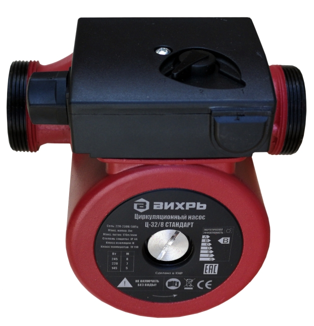 Ассортимент циркуляционных насосов пополнился новой бюджетной линейкой СТАНДАРТ с гарантийным сроком обслуживания 1 год, при этом качество насосов остается на высоком уровне. Частота, Гц: 50 Материал: Алюминий Давление, бар: 10 10 Напряжение сети, В: 220 Гарантия, мес.: 12 Страна бренда: Россия Страна производства: Китай Комплектация: Циркуляционный насос 1 шт. Сгон с накидной гайкой 2 шт. Резиновые прокладки 2 шт. Паспорт 1 шт. Упаковка 1 шт. Вес в упаковке: 3 кг Класс защиты: IP44 Бренд: Вихрь Максимальный поток, л/мин: 170 Класс изоляции: Н Класс температур: TF 110 Материал крышки насоса: Чугун Материал корпуса двигателя: Алюминий Размер резьбы на насосе: 2 дюйма Размер соединительной гайкипереходника: 1.25 дюйм Мощность, Вт 1 скорость: 145 Мощность, Вт 2 скорость: 220 Мощность, Вт 3 скорость: 245 Напор, м 1 скорость: 5 Напор, м 2 скорость: 7 Напор, м 3 скорость: 8 Модель: Ц-32/8 Циркуляционный насос ВИХРЬ Ц-32/8 предназначен для обеспечения циркуляции воды в системах отопления, круговых трубопроводах горячего и холодного водоснабжения, центральных отопительных установках и системах перекачки промышленных вод (системах кондиционирования, охлаждения). Насос представляет собой компактное устройство с всасывающей и нагнетающей функциями. Вода перекачивается при помощи вращения рабочего колеса электродвигателем насоса. Данный вид насосов надёжен, экономичен и прост в использовании. Крышка насоса изготовлена из чугуна, рабочее колесо из полимерных материалов, корпус электродвигателя из алюминия. Насос имеет три скорости работы, выбираемые ручным переключением вращающейся ручки на клеммной коробке. Охлаждение и смазка керамических подшипников осуществляется перекачиваемой жидкостью. Заглушка ротора позволяет удалять остатки воздуха из системы путём её откручивания и стравливания воздуха. В комплектацию не входит кабель подключения к сети. Следует использовать термостойкий трехжильный кабель с поперечным сечением каждой жилы не менее 0,75 мм2 и с резиновой изоляцией. В названии циркуляционных насосов Вихрь отражены два параметра, например: Ц-25/4. Первые две цифры это диаметр присоединительных патрубков. В нашем случае 25 мм (1 дюйм) диаметр резьбы гаек, поставляемых в комплекте с циркуляционным насосом. Он должен соответствовать диаметру труб (переходников) в системе отопления. В системах отопления наиболее распространены два диаметра - 25 и 32 мм. Второе число обозначает максимальный напор насоса. В нашем примере максимальный напор составляем 4 м, то есть он может создавать избыточное давление до 0,4 атм. Этот параметр должен превышать расчетный напор требуемый для системы отопления. Пример упрощенного расчета требуемого напора будет приведен ниже. Потребляемая мощность циркуляционных насосов регулируется ступенчато (3 положения). Мощность и максимальный напор для каждой ступени указан в таблице на корпусе насоса. Кабель питания подключается к клеммной колодке и в комплект не входит. Преимущества: - бесшумная работа, - установка непосредственно на трубопроводе, - малые габаритные размеры, - большой срок эксплуатации, - регулировка скорости перекачки жидкости.