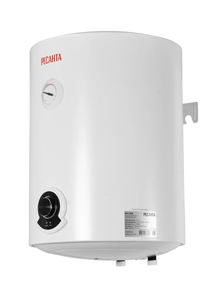 Электрический водонагреватель накопительного типа предназначен для нагрева холодной воды, поступающей в него из водопровода. Используется в бытовых целях в местах постоянного и временного проживания; в гостиницах и других жилых помещениях. Объем бака, л 30 Время нагрева 65 мин Материал бака эмалированная сталь Тип крепления вертикальное Вес нетто 11.3 кг Мощность, Вт 1500 Габариты упаковки мм 415 × 560 × 405 Гарантия, мес. 12 Бренд Ресанта Страна бренда Латвия Страна производства Китай Электропитание 220-230 В, 50 Гц Максимальная температура нагрева До 75 °С Подвод воды снизу Форма круглая Преимущества стандартных водонагревателей Ресанта: Магниевый анод против коррозии Надежная термоизоляция Устройство аварийного отключения Защита от перегрева Гарантия на бак 5 лет