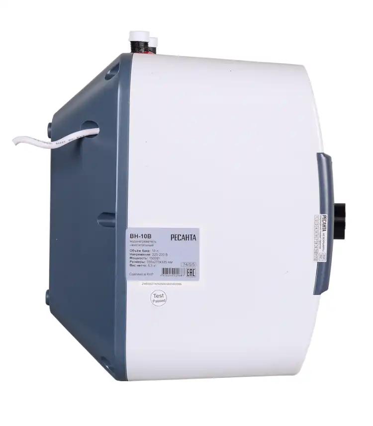 Электрический водонагреватель накопительного типа предназначен для нагрева холодной воды, поступающей в него из водопровода. Используется в бытовых целях в местах постоянного и временного проживания; в гостиницах и других жилых помещениях. Объем бака, л 10 Время нагрева 20 мин Материал бака эмалированная сталь Тип крепления под раковиной Вес нетто 6.3 кг Мощность, Вт 1500 Гарантия, мес. 12 Бренд Ресанта Страна бренда Латвия Страна производства Китай Электропитание 220-230 В, 50 Гц Максимальная температура нагрева До 75 °С Подвод воды сверху Форма плоская Размеры в коробке мм 330 х 270 х 330