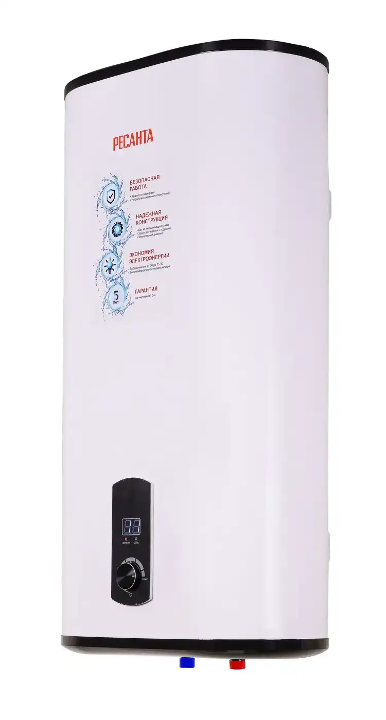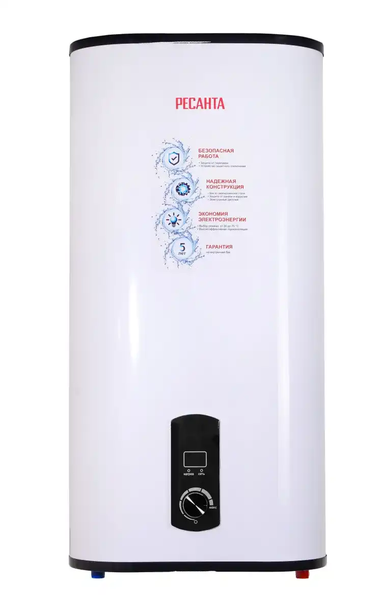 Ресанта ВН-50У предназначена для быстрого нагревания холодной воды, поступающей из центрального водопровода, в квартирах и частных домах. Объема бака в 50 л достаточно для удовлетворения бытовых нужд семьи из 2-3 человек. Бойлер оснащается цифровым дисплеем на передней панели для визуального контроля текущей температуры, а ее регулировка выполняется с помощью удобного поворотного механизма. При достижении порога в 75°C срабатывает защита от перегрева и выполняется автоматическое отключение устройства. Напряжение сети 220-230В, ~50 Гц Мощность, Вт 2000 Время нагрева 63 мин Объем бака, л 50 Гарантия, мес. 12 Вес 20.54 кг Максимальная температура нагрева 75 Тип крепления на стену вертикальное/горизонтальное Тип бака эмалированная сталь Габариты упаковки мм 436 х 270 х 870 Материал ТЭНа нержавеющая сталь Ресанта ВН-50У устанавливается в горизонтальном или вертикальном положении и подключается к стандартной сетевой розетке 220 В. Специальная крепежная планка обеспечивает надежную фиксацию, предотвращая случайное соскальзывание. Накопительный водонагреватель имеет магниевый анод, препятствующий развитию коррозии на стенках бака и сварных швах. Максимальная безопасность эксплуатации достигается за счет УЗО: при пробое кабеля и утечках тока на корпус оно мгновенно отсоединяет устройство от электросети.