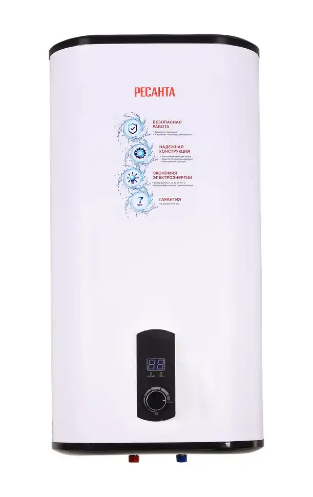 Ресанта ВН-50В относится к категории накопительных водонагревателей. Функция электронагревательного устройства заключается в быстром нагреве холодной водопроводной воды. Модель подходит как для постоянного, так и для временного применения в жилых помещениях, гостиницах, салонах красоты, парикмахерских и др. Бойлер отличается мощностью 2000 Вт, что обеспечивает нагрев воды в течение 63 минут. Встроенный термостат предназначен для регулировки температуры до 75 °С. Во избежание перегрева предусмотрена система автоматического отключения и включения. Форма плоская с нижним подключением воды. Бак вмещает объем на 50 литров, выполнен из нержавеющей стали, этого достаточно для семьи из 4 человек. Напряжение сети 220-230В, ~50 Гц Мощность, Вт 2000 Объем бака, л 50 Время нагрева 63 мин Материал бака нержавеющая сталь Тип крепления вертикальное Мощность, Вт 2000 Гарантия, мес. 12 Бренд Ресанта Страна бренда Латвия Страна производства Китай Вес 13.78 кг Электропитание 220-230 В, 50 Гц Максимальная температура нагрева 75 °С Подвод воды снизу Тип бака нержавеющая сталь Форма плоская Размеры в коробке мм 440 х 260 х 870 Габариты упаковки мм 930 х 495 х 305 Термометр есть