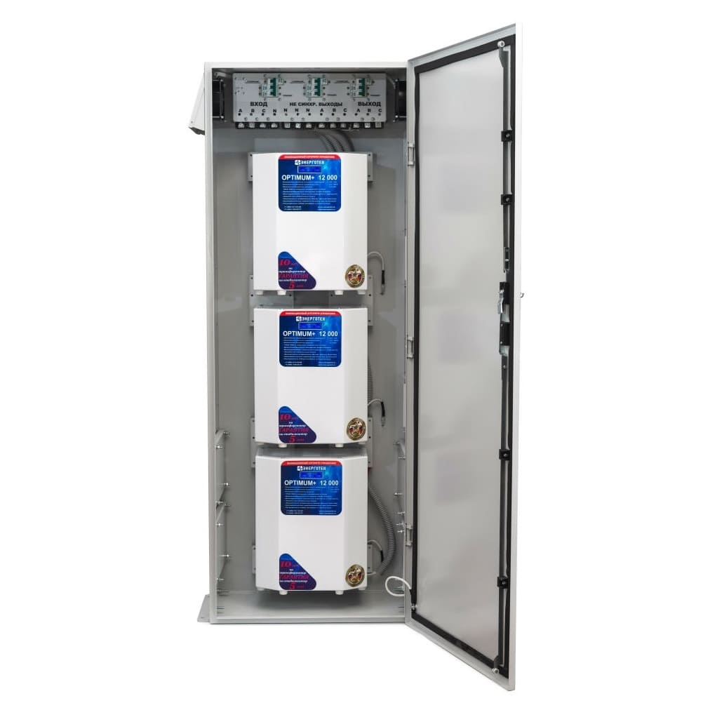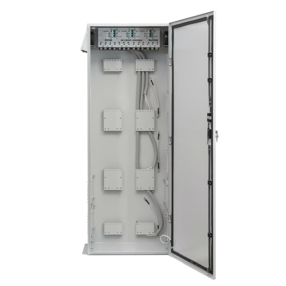 Всепогодный шкаф ST+БКС с внешним байпасом и синхронизацией фаз для стабилизаторов напряжения для моделей STANDARD, OPTIMUM+, UNIVERSAL, INFINITY мощностью от 5 до 20 кВА. Шкаф рассчитан на эксплуатацию при температуре окружающей среды от -25 до +45 °C, относительной влажности до 80% (при 25°C) и атмосферном давлении от 630 до 800 мм рт. ст Общие технические характеристик шкафа ST+БКС Номинальное входное напряжение 380, В Номинальная частота питающей сети 50, Гц Класс защиты IP 33 Климатическое исполнение УХЛ 1 Масса 69, кг Габаритные размеры шкафа 375 х 695 х 1650 (Г × Ш × В), мм Всепогодный шкаф ST+БКС обеспечивает: удобный и компактный монтаж стабилизаторов; возможность, при необходимости, установки стабилизаторов разной мощности и точности; защиту стабилизаторов от дождя, снега и прямых солнечных лучей; принудительную вентиляцию при повышении температуры окружающей среды. время обесточенного состояния нагрузки при использовании внешнего байпаса не более 1 минуты; защиту от пропадания и асимметрии фаз для трехфазных нагрузок; бесперебойную работу однофазных нагрузок, при пропадании напряжения на соседней фазе; возможность, при необходимости, объединения стабилизаторов разной мощности и точности; задержку на отключение трехфазной нагрузки после пропадания напряжения на одной из фаз 3 секунды; задержку на включение трехфазной нагрузки после восстановления напряжения на всех трех фазах 5 секунд; защиту трехфазной нагрузки в режиме транзит от выхода напряжения за границы диапазона 180 260 В; Шкаф представляет собой металлический корпус. В верхней части по бокам располагаются вентиляционные отверстия с защитными козырьками. В нижней части располагаются жалюзи для забора воздуха. С правой стороны снизу находятся гермовводы для подводящих кабелей и болт заземления. Внутри шкафа вверху расположен блок коммутации и синхронизации. Внизу блока находятся клеммные колодки, служащие для подсоединения подводящих и отходящих проводов. На передней панели блока расположены переключатели режимов работы каждого подключенного стабилизатора, «Стабилизация» - «Транзит» и четыре светодиода индикации режима работы блока синхронизации и вентиляции. Внутри блока расположен контактор, который подает напряжение на трехфазный выход только, когда напряжение на всех трех фазах находится в диапазоне 180 260 В. При работе всех трех стабилизаторов в режиме «Стабилизация» блок контролирует только пропадание фаз. При переключении одного или нескольких переключателей в режим «Транзит», блок может отключить трехфазный выход при сильном отклонении напряжения (выходе за диапазон 180 260 В) на нестабилизированной фазе. Отключение трехфазной нагрузки при пропадании напряжения на одной из фаз происходит с задержкой в 3 секунды, в течение этого времени мигает красный светодиод «Авария». Кроме случая, когда отключилась фаза А, напряжение которой используется для питания контактора. В этой ситуации трехфазная нагрузка будет обесточена сразу, а не позднее чем через 1 секунду погаснет зеленый и загорится красный светодиод. Подключение трехфазной нагрузки контактором происходит с задержкой в 5 секунд после восстановления напряжения на всех трех фазах, в течение этого времени подмигивает (яркость свечения меняется от полной до половинной) красный светодиод «Авария». Для однофазных нагрузок на сто