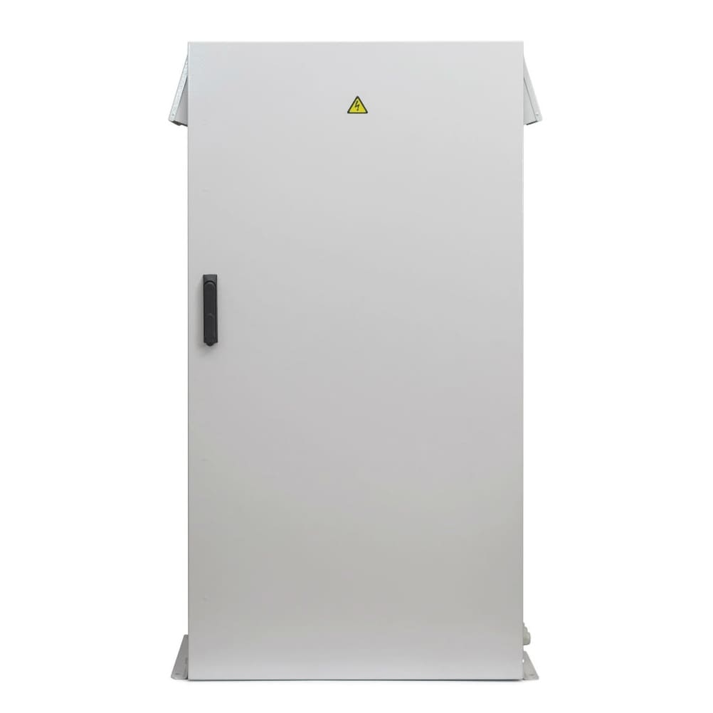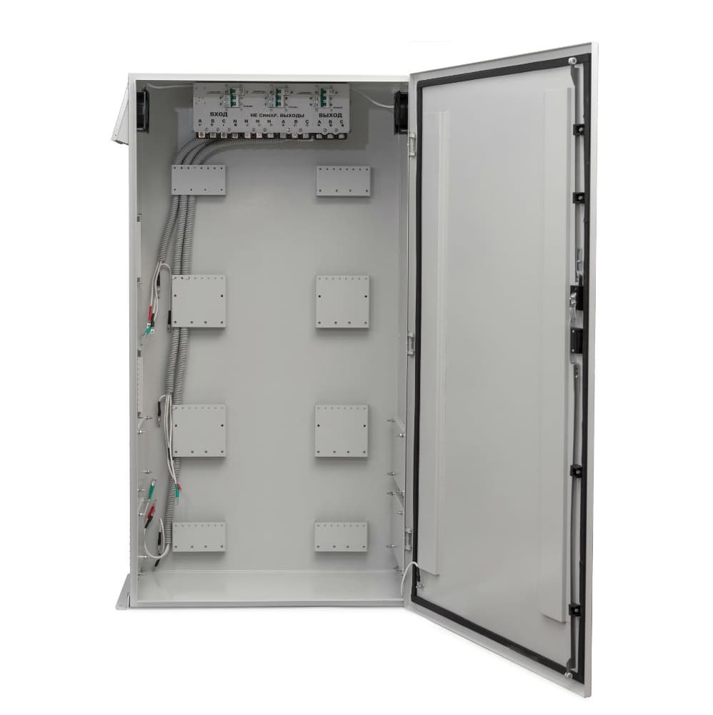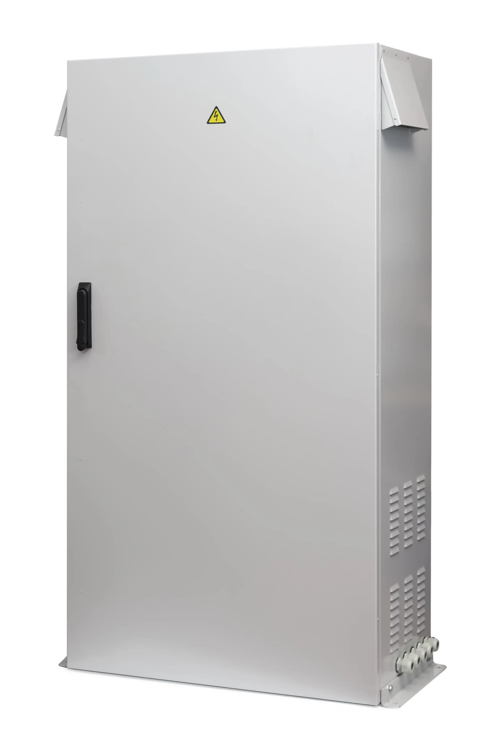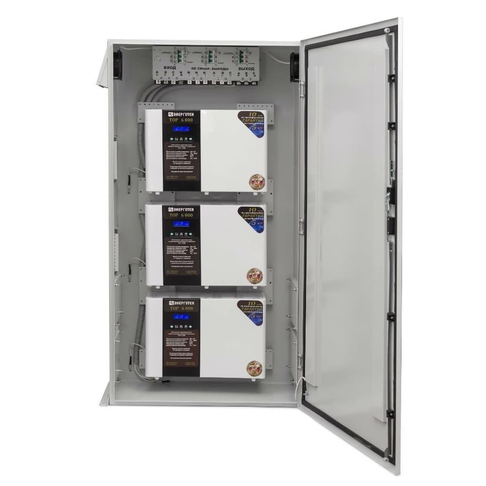 Всепогодный шкаф TP+БКС с внешним байпасом и синхронизацией фаз для стабилизаторов напряжения моделей ТОР и PRIME мощностью от 6 до 20 кВА. Шкаф рассчитан на эксплуатацию при температуре окружающей среды от -25 до +45 °C, относительной влажности до 80% (при 25°C) и атмосферном давлении от 630 до 800 мм рт. ст Общие технические характеристик шкафа TP+БКС: Номинальное входное напряжение 380, В Номинальная частота питающей сети 50, Гц Класс защиты IP 33 Климатическое исполнение УХЛ 1 Масса 84, кг Габаритные размеры шкафа 425 х 895 х 1515 (Г × Ш × В), мм Всепогодный шкаф TP+БКС обеспечивает: удобный и компактный монтаж стабилизаторов; возможность, при необходимости, установки стабилизаторов разной мощности и точности; защиту стабилизаторов от дождя, снега и прямых солнечных лучей; принудительную вентиляцию при повышении температуры окружающей среды. Шкаф представляет собой металлический корпус. В верхней части по бокам располагаются вентиляционные отверстия с защитными козырьками. В нижней части располагаются жалюзи для забора воздуха. С правой стороны снизу находятся гермовводы для подводящих кабелей и болт заземления. Внутри шкафа вверху располагаются клеммные колодки для подсоединения силовых проводов и плата управления. Навесы для стабилизаторов крепятся к скобам на задней стенке. Скобы обеспечивают зазор между стабилизатором и задней стенкой, необходимый для прокладки проводов. Для удобного доступа к клеммным колодкам стабилизаторов на левой стороне находятся монтажные окна со съемными крышками. Вентиляторы охлаждения работают от фазы А (верхний стабилизатор), поэтому следует учитывать, что при отсутствии питающей фазы охлаждение работать не будет. При необходимости осуществления обслуживания, ремонта или замены одного из стабилизаторов шкаф следует полностью обесточить.
