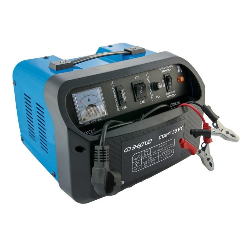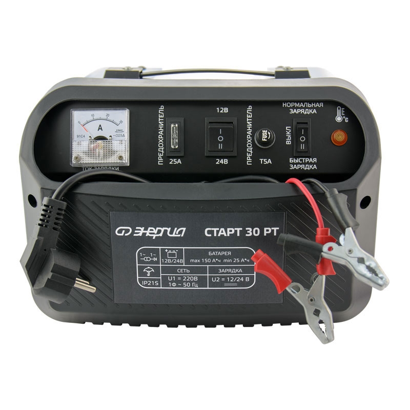 Трансформаторное зарядное устройство Энергия СТАРТ 30 РТ оснащено индикатором тока заряда и может работать в двух режимах: быстрый заряд и нормальный заряд. Предназначено для зарядки всех типов свинцово-кислотных аккумуляторных батарей (АКБ с жидким электролитом, с абсорбированным электролитом и гелевых АКБ). Напряжение питания (В): 220±15% Номинальная частота переменного тока (Гц): 50/60 Максимальная мощность (Вт) (при 12/24В): 240/360 Номинальное напряжение АКБ (В): 12/24 Максимальный зарядный ток (А): 25 Номинальная емкость подключаемых батарей (А*ч): 25-150 Диапазон рабочих температур (°С): -10...+40 Переключатель режимов заряда АКБ: Есть Предпусковая подготовка: Есть Охлаждение: Конвекционное Типы заряжаемых АКБ: С абсорбированным электролитом (AGM / С гелеобразным электролитом (GEL) / С жидким электролитом (WET) Тип зарядного устройства: Трансформаторное Встроенные средства защиты: Короткое замыкание / Неправильная полярность / Перегрузка Габаритные размеры (мм): 280х215х220 Вес (кг): 5,6 Особенности Ручное переключение напряжения заряжаемых батарей 12/24В; Стандартная и быстрая зарядка для аккумуляторов 12/24В; Защита от перегрева, неправильной полярности и короткого замыкания; Надежная конструкция для длительной эксплуатации; Карман для хранения проводов.