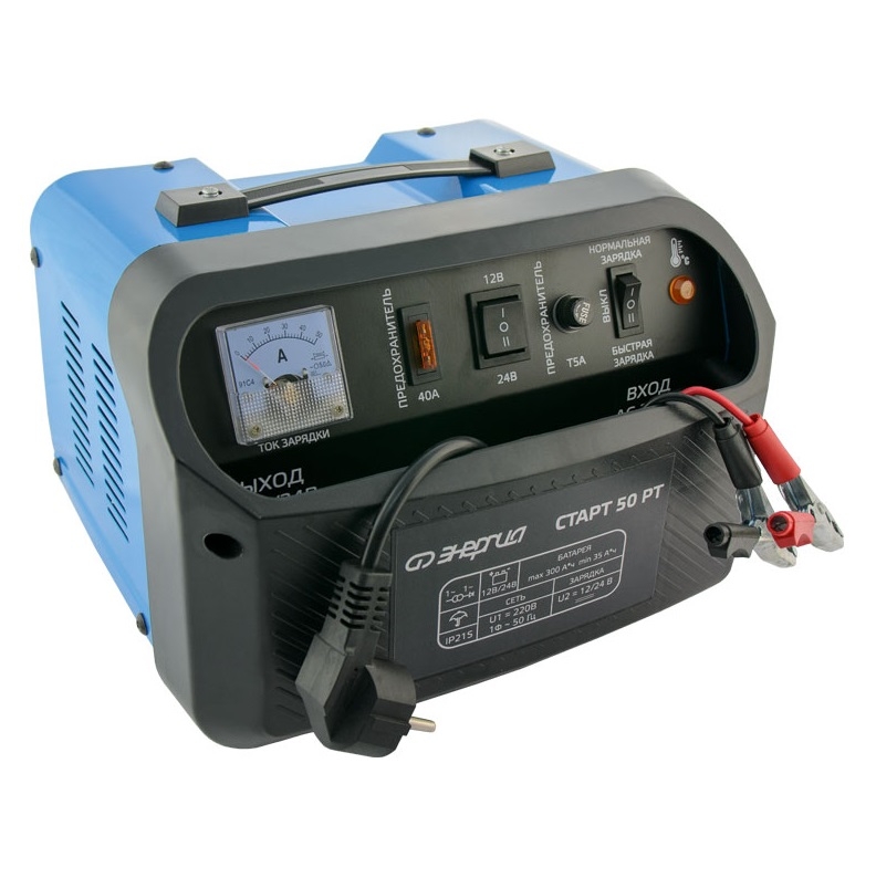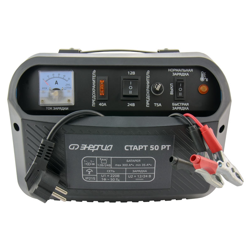 Энергия СТАРТ 50 РT трансформаторное зарядное устройство оснащено индикатором тока заряда и может работать в двух режимах заряда: быстрый и нормальный. Предназначено для зарядки свинцово-кислотных аккумуляторных батарей, таких как: АКБ с жидким электролитом (WET), с абсорбированным электролитом (AGM), и с гелеобразным электролитом (GEL). Напряжение питания (В): 220±15% Номинальная частота переменного тока (Гц): 50/60 Максимальная мощность (Вт) (при 12/24В): 360/720 Номинальное напряжение АКБ (В): 12/24 Максимальный зарядный ток (А): 40 Номинальная емкость подключаемых батарей (А*ч): 35-300 Диапазон рабочих температур (°С): -10...+40 Переключатель режимов заряда АКБ: Есть Предпусковая подготовка: Есть Охлаждение: Конвекционное Типы заряжаемых АКБ: С абсорбированным электролитом (AGM / С гелеобразным электролитом (GEL) / С жидким электролитом (WET) Тип зарядного устройства: Трансформаторное Встроенные средства защиты: Короткое замыкание / Неправильная полярность / Перегрузка Габаритные размеры (мм): 280х215х220 Вес (кг): 7,4 Особенности Ручное переключение напряжения заряжаемых батарей 12/24В; Стандартная и быстрая зарядка для аккумуляторов 12/24В; Защита от перегрева, неправильной полярности и короткого замыкания; Надежная конструкция для длительной эксплуатации; Карман для хранения проводов.